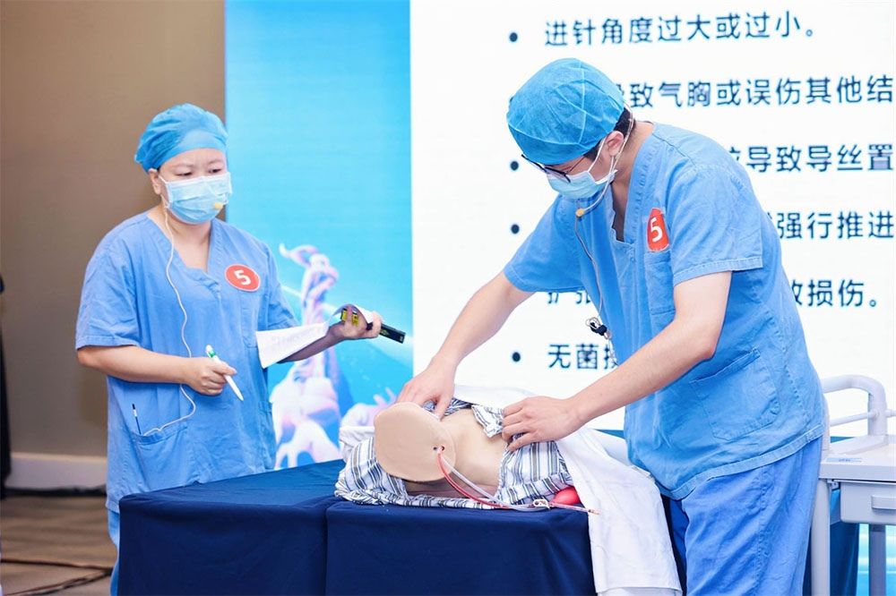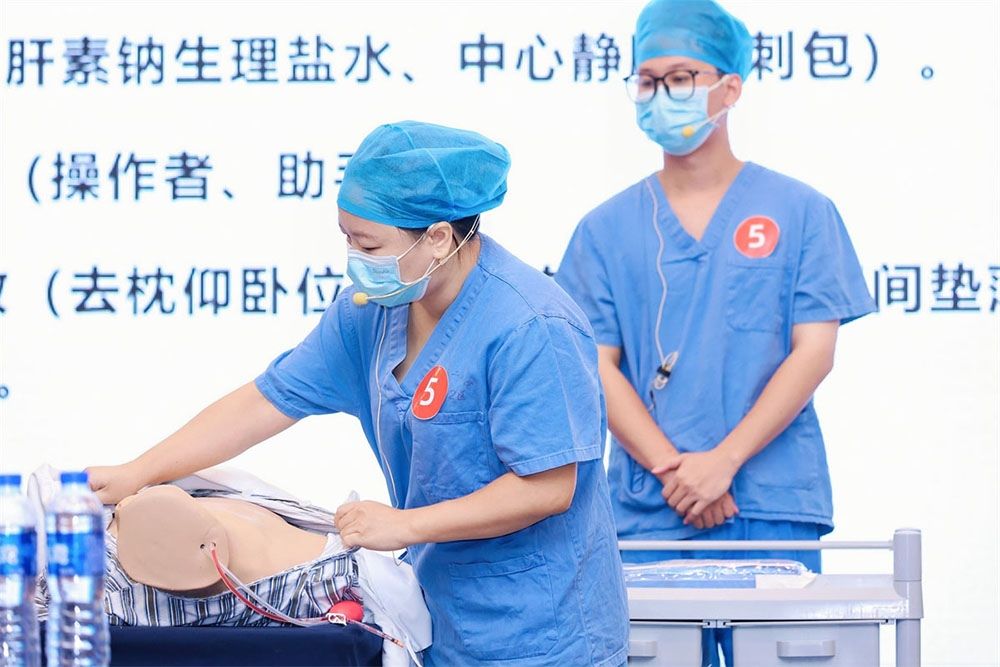 赛场即战场,比赛现场紧张激烈,附二院代表队沉着应战、默契配合。在深静脉穿刺术的操作演练中,队员们迅速准确地完成病情评估,流程清晰地开展教学演练,操作规范、行云流水,其表现出的精湛技艺和人文关怀赢得了评委专家组的高度认可和现场同仁的广泛赞誉。