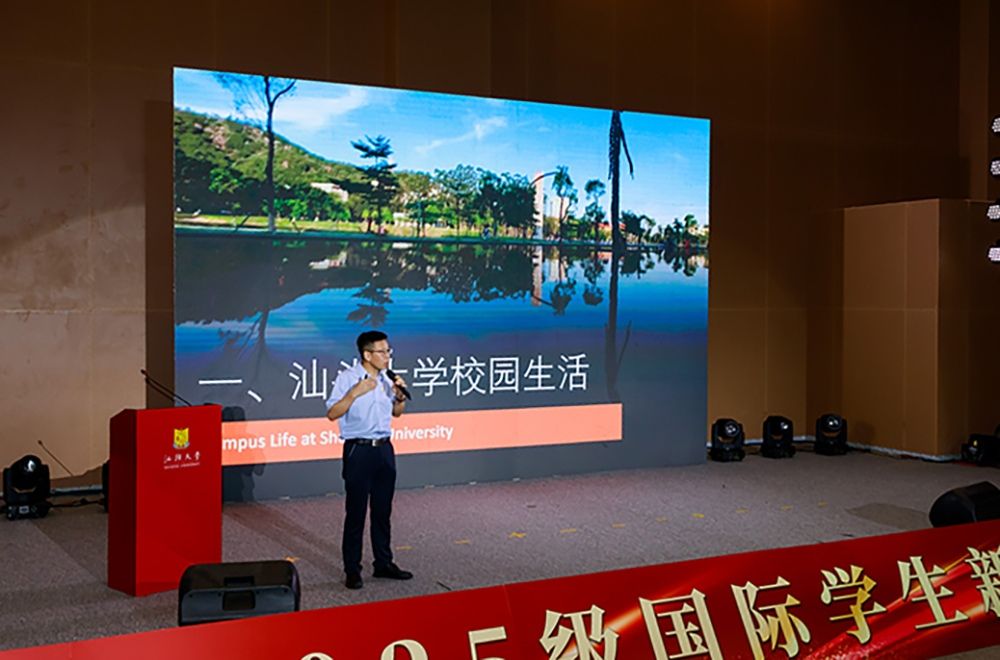 刘文华在大会上发表致辞。他首先代表学校对2025级国际学生新生表示热烈欢迎,并通过分享个人来汕工作经历,向学生介绍了汕头整体环境、文化风俗、地区特色以及汕头大学基本情况、发展愿景等。他表示,大学学习是人生最宝贵的经历,希望全体国际学生能尽快完成身份转变,融入汕头大学校园生活,珍惜在汕头大学学习的机会,以勤勉为舵,顺利完成学业。