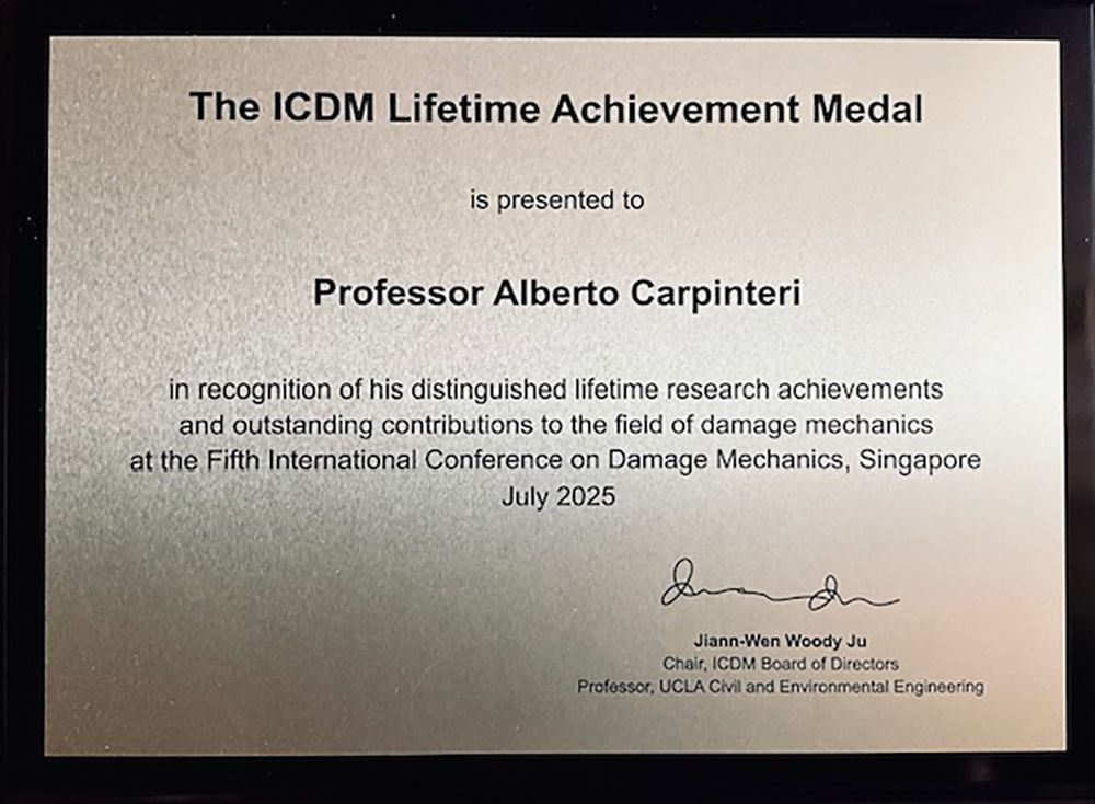 7月17日,第五届国际损伤力学国际会议(ICDM)在新加坡举行,汕头大学工学院教师Alberto Carpinteri教授被授予“国际损伤力学终身成就奖”,以表彰其在该领域作出的奠基性与持续性的卓越贡献。该奖项由大会主席、加州大学洛杉矶分校Jiann-Wen Woody Ju教授亲自颁发,是国际损伤力学领域的最高学术荣誉之一。
