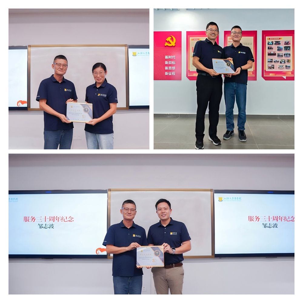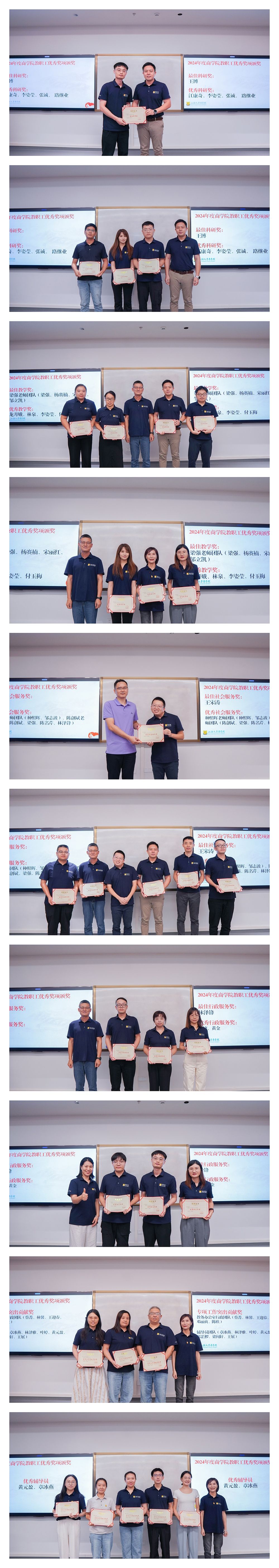 为表彰先进,带动教师以榜样为镜、积极进取、互相学习,推动学院建设与发展,学院评选出商学院2024年度教职工年度奖项获奖名单,并为服务满十周年、二十周年、三十周年的教职工颁发纪念牌匾。