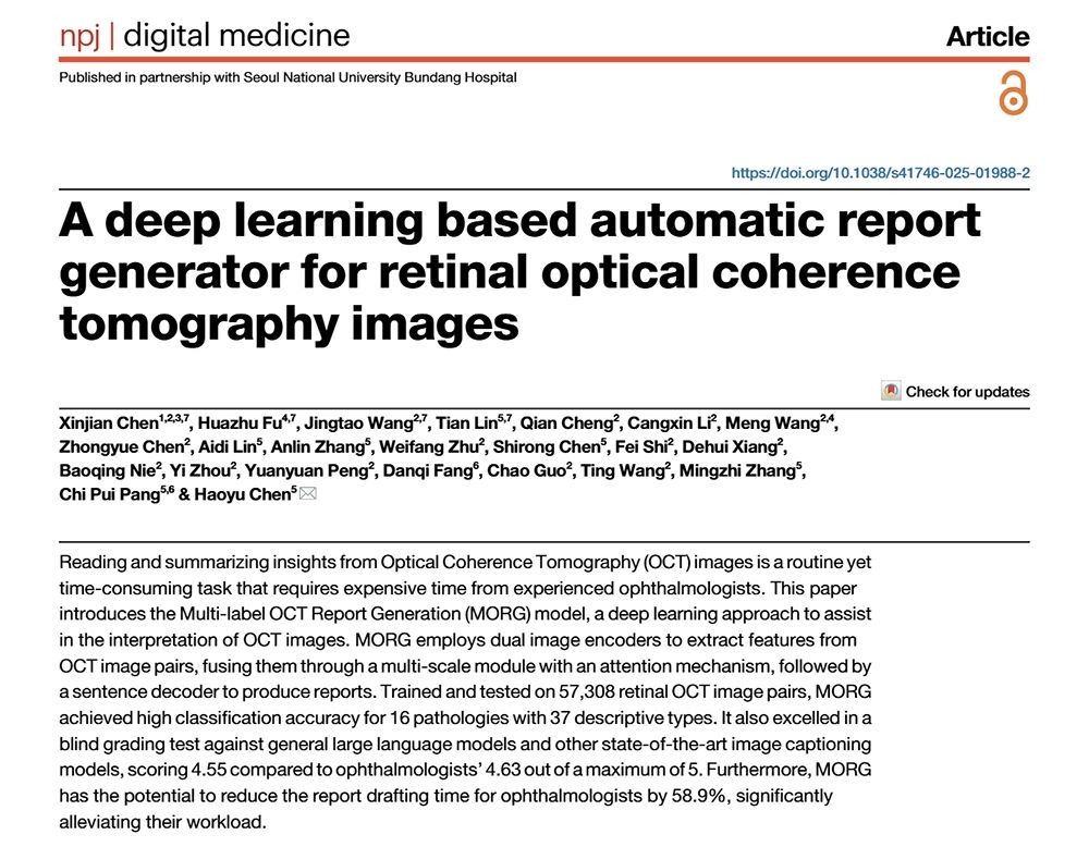 近期,汕头大学·香港中文大学联合汕头国际眼科中心、电子科技大学、苏州大学和新加坡科技研究局等机构的研究团队联合开发了一种名为多标签OCT报告生成器(MORG)的深度学习模型,为这一难题带来了创新性解决方案。MORG能够自动解读视网膜OCT图像并生成专业报告,显著提升诊断效率,大幅减轻眼科医生的工作负担。这一研究成果以《A Deep Learning Based Automatic Report Generator for Retinal Optical Coherence Tomography Images》为题,发表于国际知名期刊《npj Digital Medicine》(中国科学院一区Top期刊,影响因子15.1)。