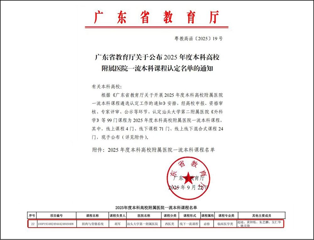 近日,广东省教育厅发布了《关于公布2025年度本科高校附属医院一流本科课程认定名单的通知》(粤教高函〔2025〕19号),由汕头大学医学院第一附属医院(以下简称附一院)骨科牵头负责的汕头大学医学院《肌肉与骨骼系统》模块课程荣获省一流课程认定,为附一院医学教育高质量发展再添重要成果。