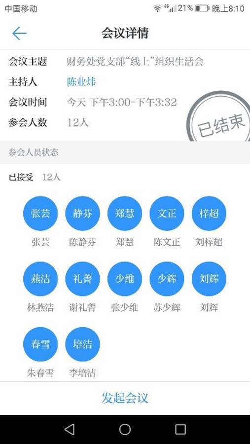 3月18日下午3:00,按学校党委组织部发布的《关于基层党组织在疫情防控期间开展组织生活和党员教育培训工作的通知》、 《关于基层党组织在疫情防控期间开展组织生活的补充通知》以及机关工委的相关工作部署,财务处党支部借助学习强国APP中的“强国视频会议”平台召开线上组织生活会。财务处党支部11名党员、2名入党积极分子全体参加会议。