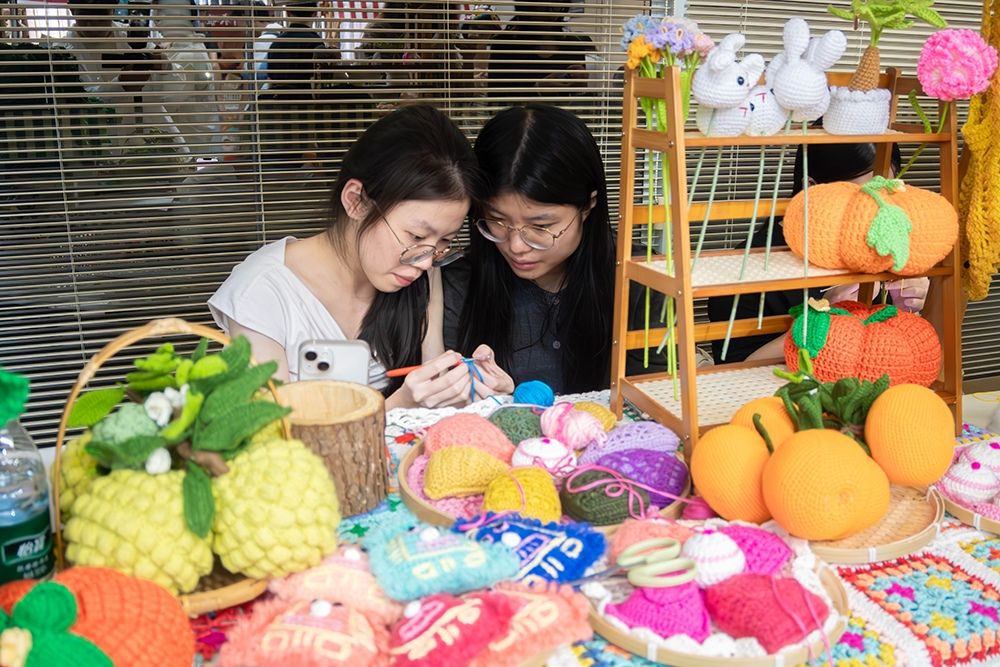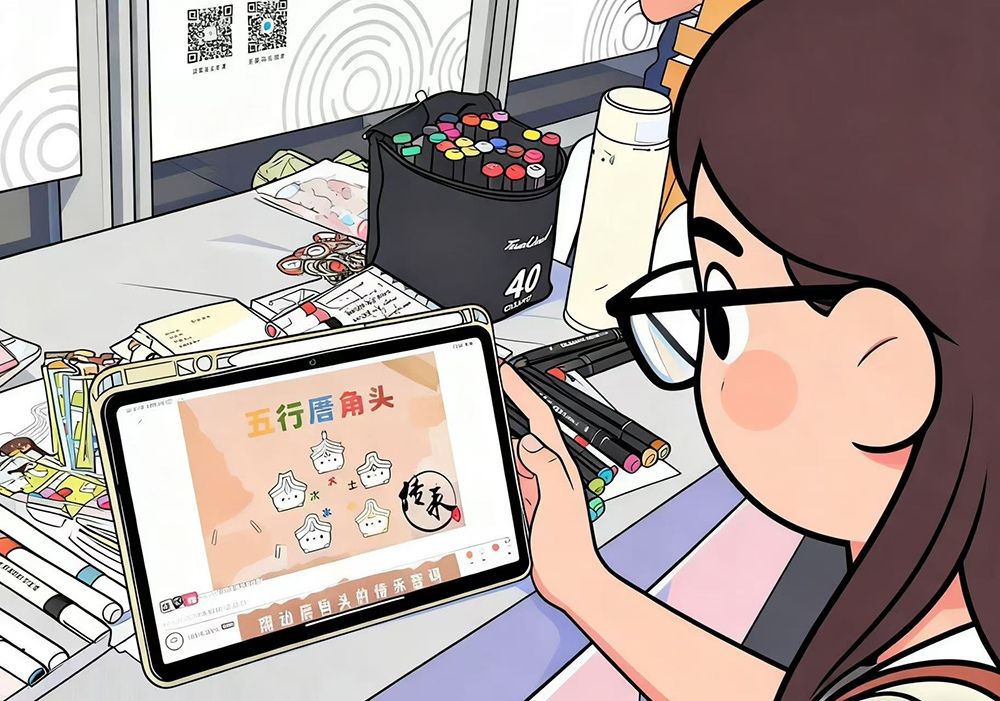 活动现场的非遗工坊集群堪称一场文化盛宴。传统技艺类非遗项目中,“指尖锦绣,潮韵流芳”潮绣体验让师生们在针线穿梭中感受刺绣的细腻;“古艺新枝,偶韵未央”铁枝木偶展示,生动演绎了传统木偶艺术的魅力;“雕琢千年,贴金流彩”潮州木雕介绍,呈现了木雕工艺的精湛绝伦。民俗文化类的“百草成园,巧手制囊”中医药香囊制作,让大家在药草香气中体会传统养生智慧;“针韵传古,线订春秋”四孔穿线装书技艺体验,带大家重温古籍装帧的匠心。数字融合类非遗项目亮点纷呈,“粿印传香,潮韵悠扬”潮汕粿印展示、“朗朗歌册,火帝巡游”潮州歌册介绍等项目,以数字技术为桥,让传统非遗焕发新活力。其中,“绘意厝角,巧辨五行”五行厝角头介绍摊位尤为吸睛,现场循环播放的科普视频极具巧思——借助AI技术将潮汕传统建筑构件“五行厝角头”打造成拟人化小精灵,以灵动可爱的形象、简约有趣的叙事风格,生动解读其蕴含的美好寓意与文化密码,收获参与者的一致点赞。其他摊位亦各展巧思,充分运用人工智能等现代科技,打破传统非遗的呈现边界,让古老文化在科技赋能下愈发鲜活可感,尽显创意无限的文化创新魅力。