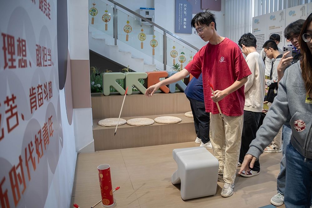 文化游园闯关环节同样热闹非凡。师生们手持集章卡,在书院各楼层开启非遗探索之旅。“红色印记・初心铭刻”让大家在摄影互动中铭记文化根脉;“时序轮转・节气排序”考验了大家对传统节令的认知;“投壶雅韵・文化传承”则在古礼体验中感受古人的雅致生活;“剪刻流年・纸间生花”剪纸闯关和“巧手匠心・非遗手作”香囊制作,让大家在动手实践中收获非遗创作的乐趣。