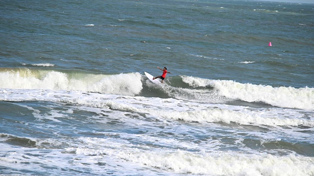 这是一个别样的课堂。海浪声取代了上课铃声,教室是整片海湾,课桌是绵延的沙滩,教具是手中的相机,教材则是全运会冲浪比赛现场。