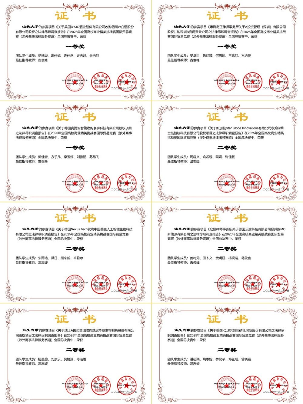 在2025年全国高校商业精英挑战赛国际贸易竞赛(涉外商事法律服务赛道)总决赛中,汕头大学法学院喜获八项国奖,其中包括3项一等奖以及5项二等奖。在古俊峰博士与温志媛博士两位老师的悉心指导下,法学院本科生和研究生组成的八支队伍参赛并全部荣获全国奖项,汕头大学也获得最佳院校组织奖。