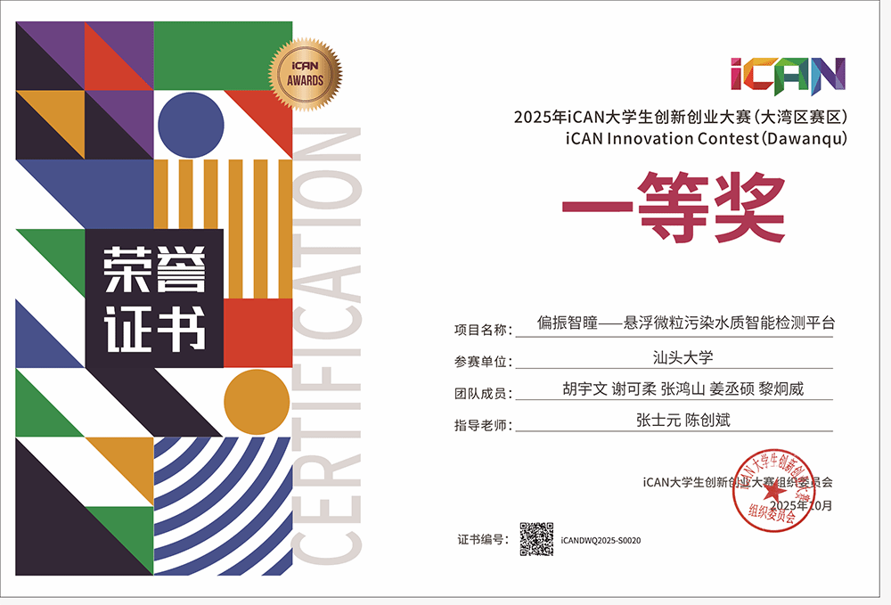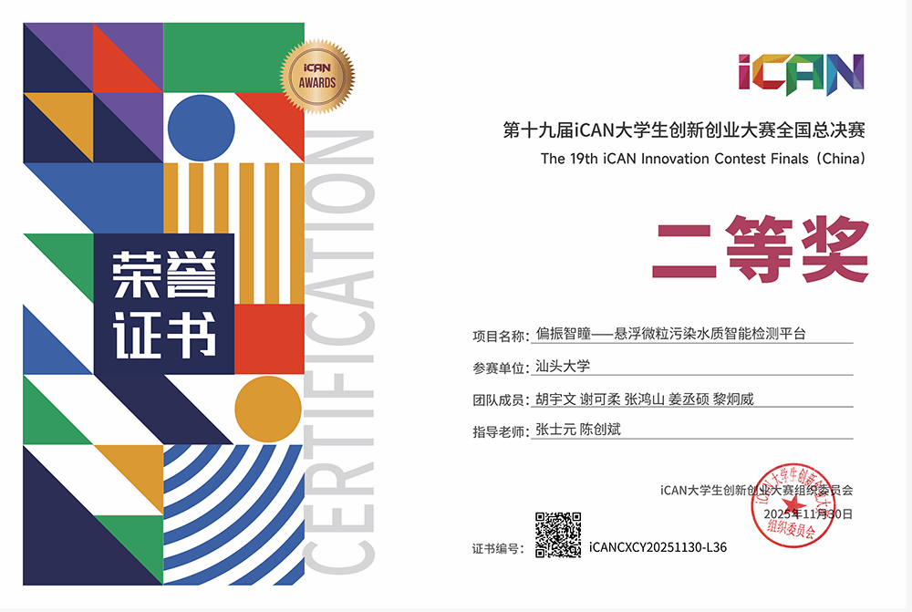 近日,2025年iCAN大学生创新创业大赛全国总决赛在杭州落下帷幕。汕头大学理学院“偏振智瞳——悬浮微粒污染水质智能检测平台”项目团队凭借过硬的技术实力和创新方案,从全国超3.6万个参赛项目中脱颖而出,最终斩获全国二等奖。