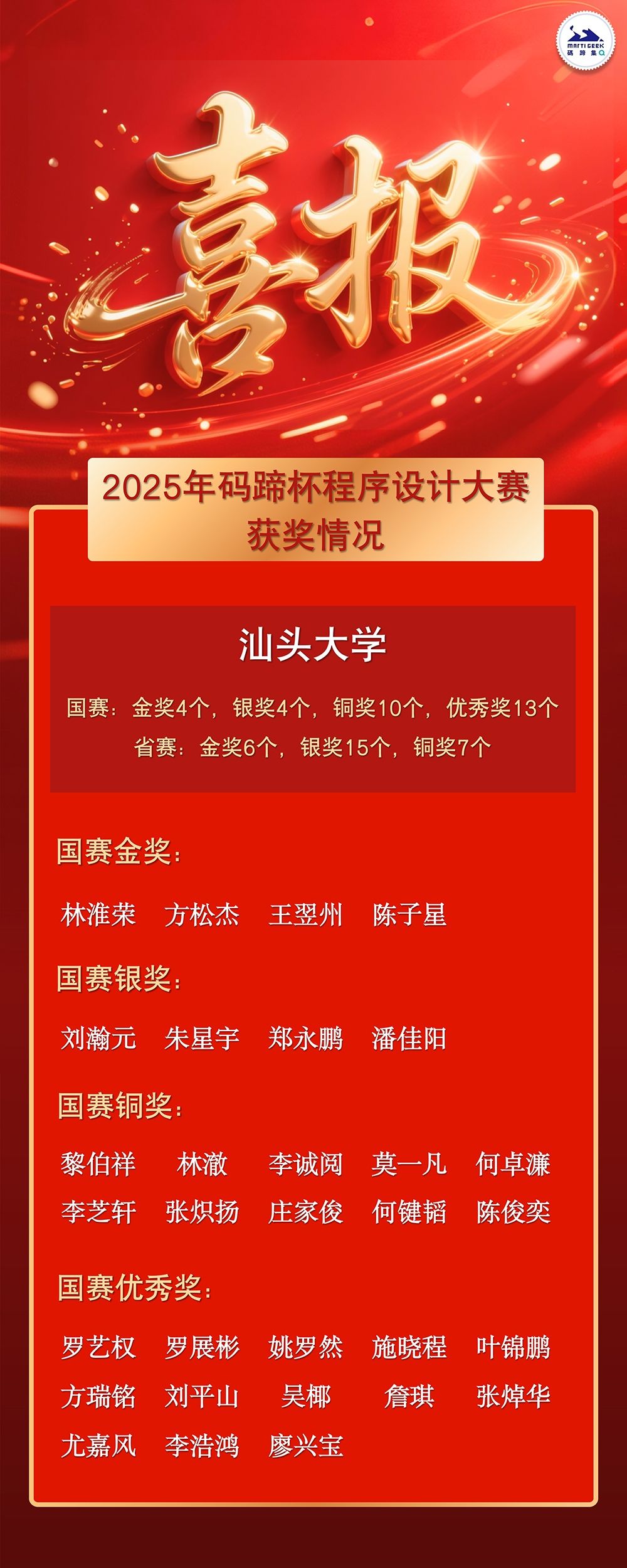 近日,2025年第七届码蹄杯全国大学生程序设计大赛(以下简称“码蹄杯”)组委会发来喜报,汕大代表队在全国总决赛中表现卓越,一举斩获金奖4项、银奖4项、铜奖10项及优秀奖13项。在金奖榜中,汕大名列全国第14位,广东第3位(仅次于华南理工大学和深圳大学)。同时,教练组陈银冬老师也被评为总决赛“优秀教练”。