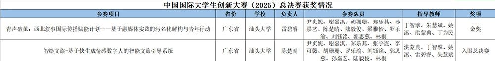 近日,教育部发布“中国国际大学生创新大赛(2025)总决赛”拟获奖项目名单,汕头大学“青声破茧——西北叙事国际传播赋能计划——基于融媒体实践的污名化解构与青年行动”项目及“智绘文旅——基于快生成情感数字人的智能文旅引导系统”项目在全国报名参赛项目中脱颖而出,分别获得全国铜奖及入围奖。