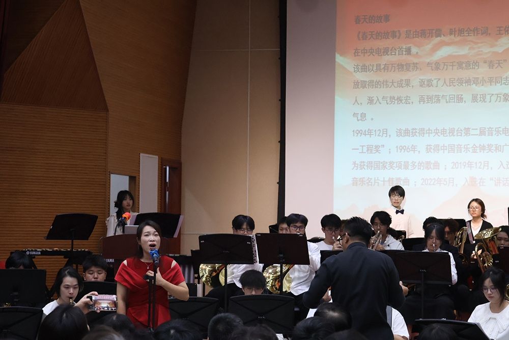 第四篇章:伟大的时代。本篇章聚焦改革开放以来国家发展的辉煌成就与人民对美好生活的向往。《在希望的田野上》由著名作曲家施光南作曲,描绘了农村改革后生机勃勃的面貌,是改革开放初期的时代号角;《春天的故事》由作曲家王佑贵创作,以邓小平同志三次南方考察为背景,用温暖旋律讲述改革开放带来的历史性巨变,本曲由周丽新老师与汕头大学交响管乐团联袂演绎,歌声悠扬、情感饱满,唤起全场对伟大时代的集体记忆;《我的祖国》作为压轴曲目,前半段柔美抒情,后半段豪迈激昂,特别是“朋友来了有好酒,若是那豺狼来了,迎接它的有猎枪”一句,生动诠释了志愿军保家卫国的坚定立场。全场观众自发跟唱,气氛达到高潮。