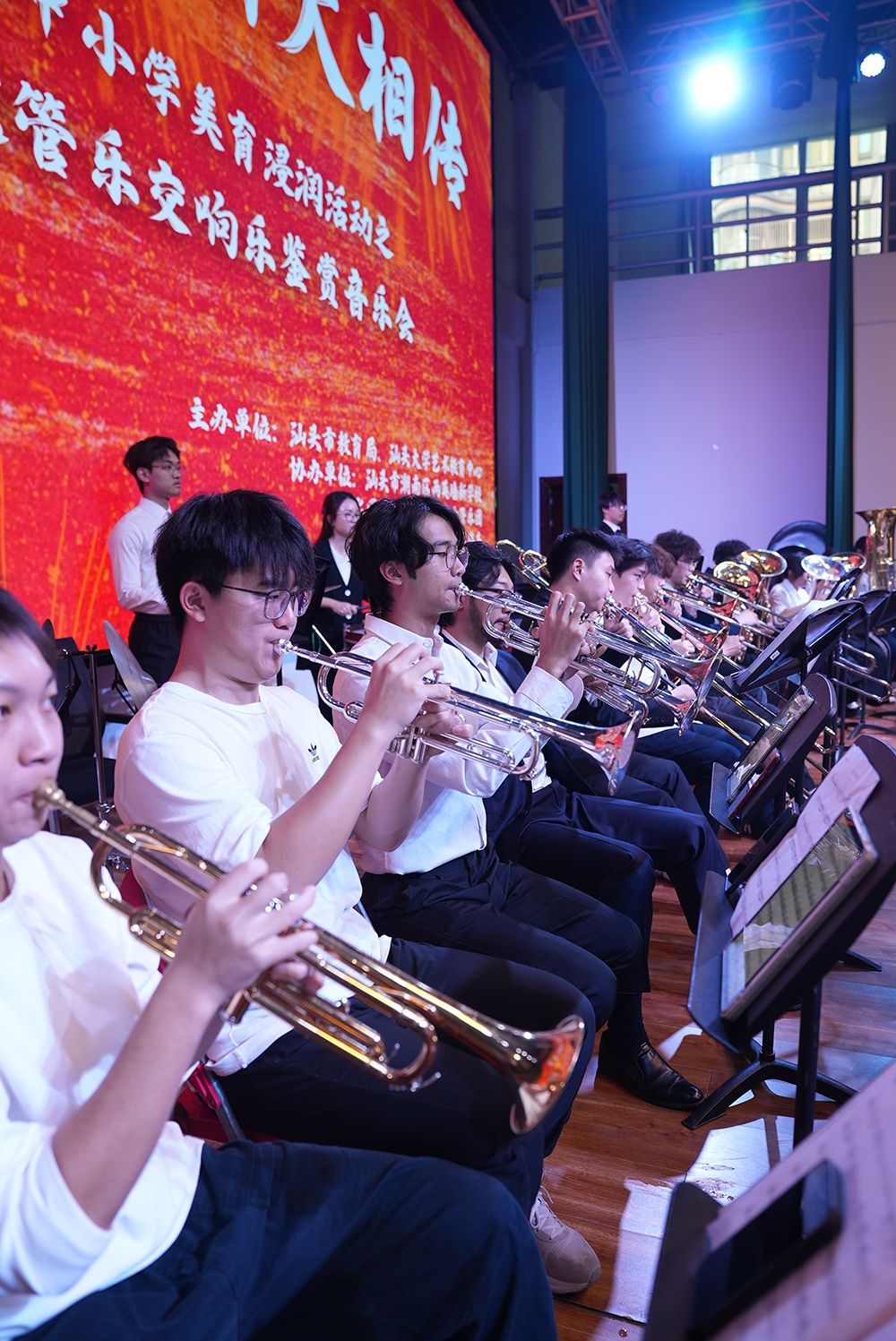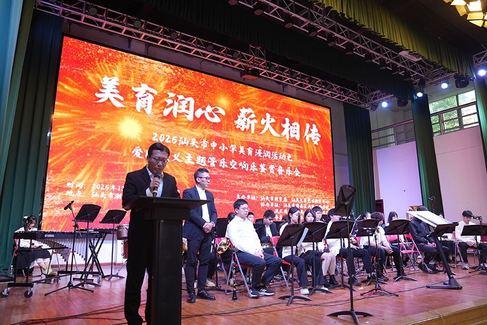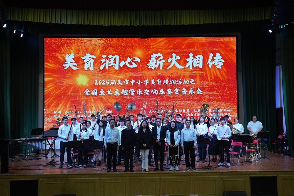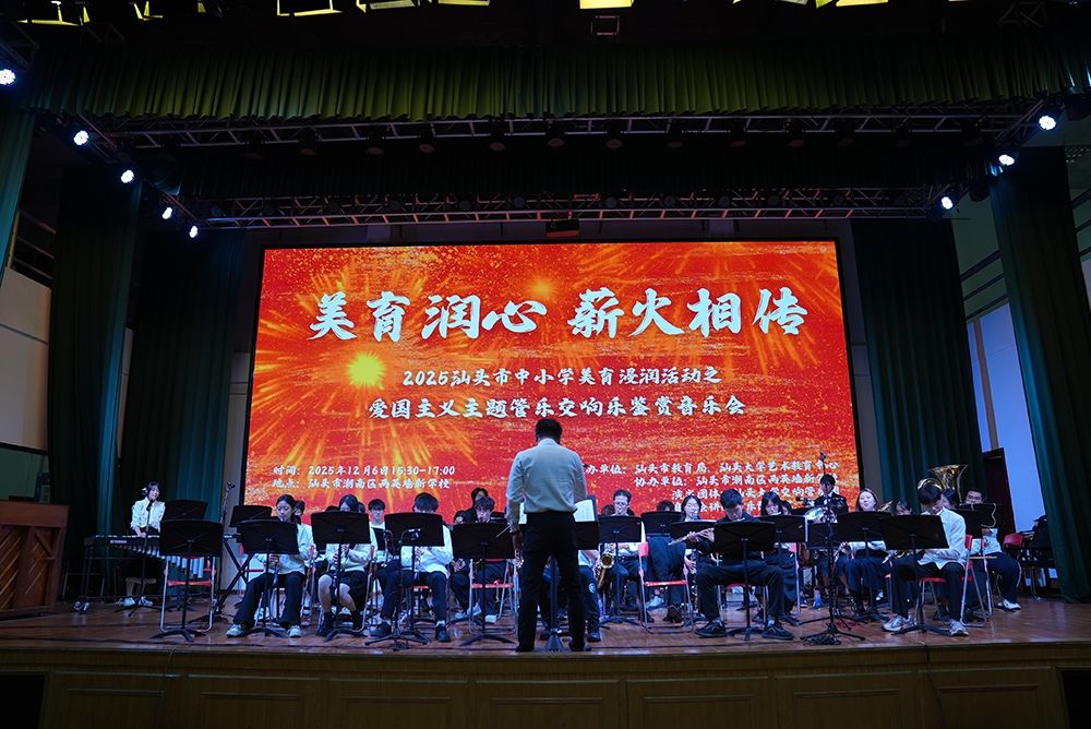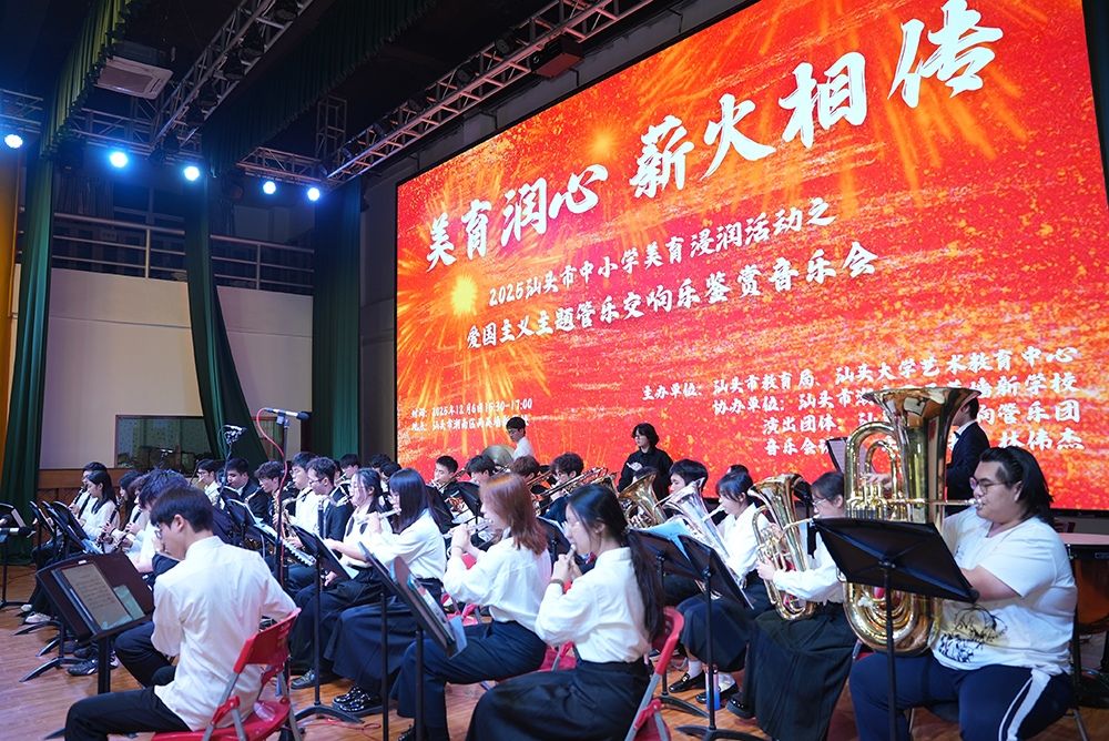 12月6日下午3:30,汕头市中小学美育浸润活动之爱国主义主题管乐交响乐鉴赏音乐会在潮南区两英墙新学校举行。本次活动由汕头市教育局、汕头大学艺术教育中心联合主办,汕头大学交响管乐团倾情献演,以经典红色旋律为纽带,将美育教育与爱国主义教育深度融合,为现场师生呈现了一场穿越时空、激荡心灵的视听盛宴。