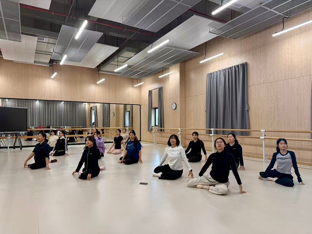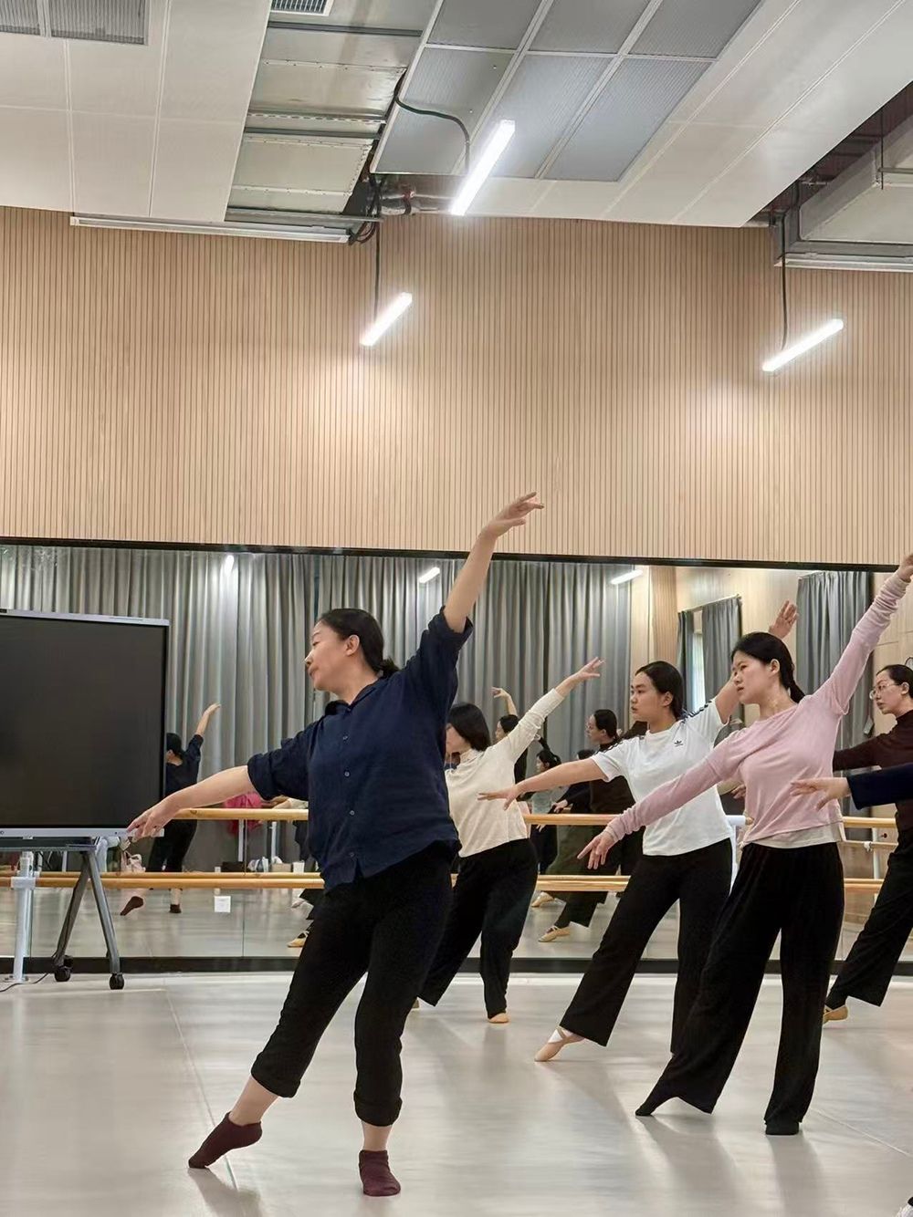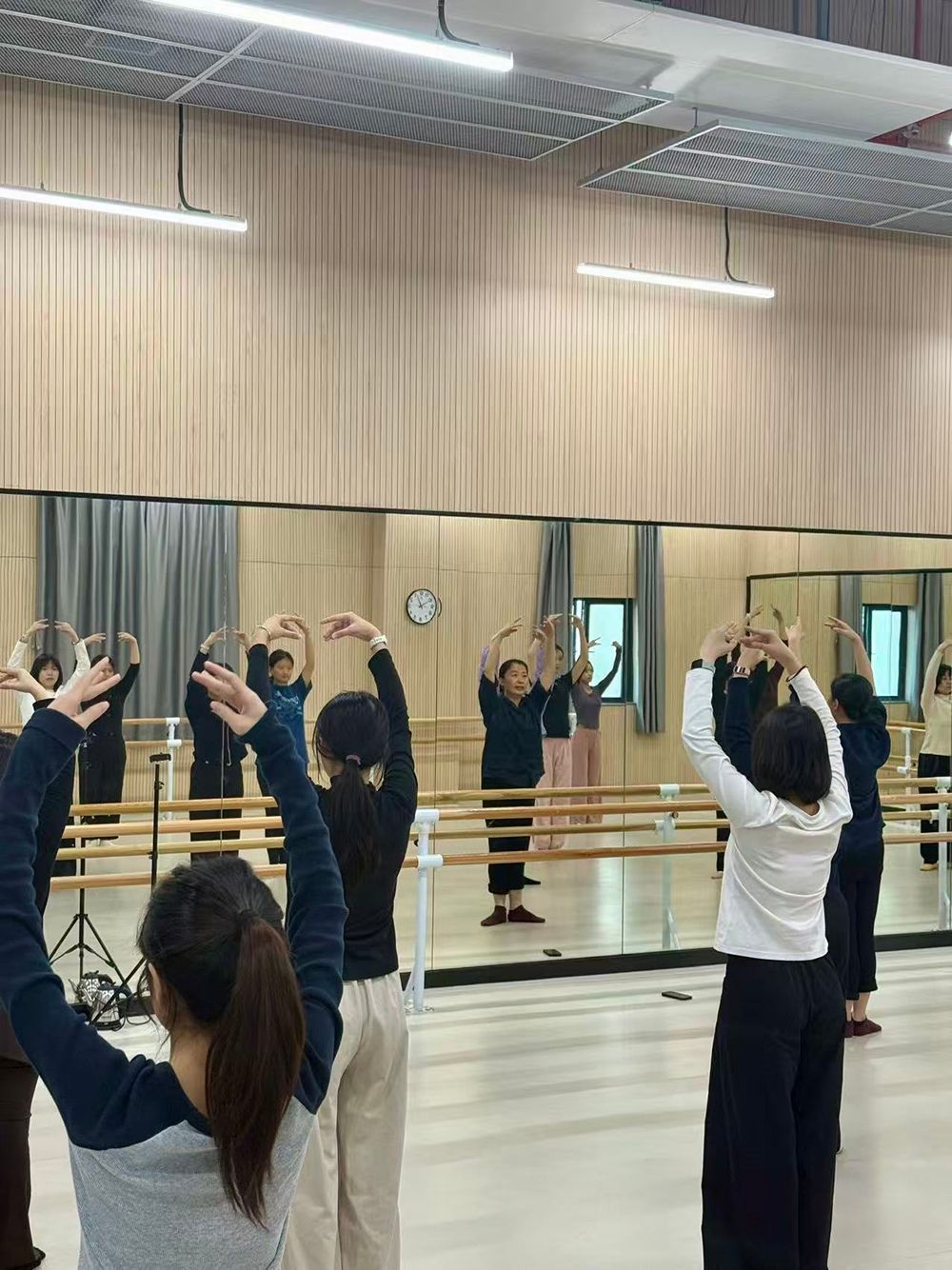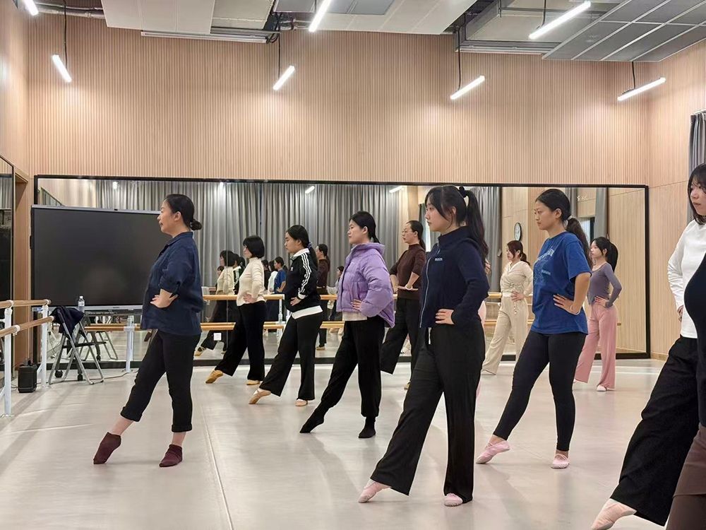 活动伊始,余端嵘从芭蕾基础训练入手,从芭蕾基础体态的唤醒与激活出发,带领全体教师开展系统性的基础肢体活动组合练习。通过针对性地肢体激活训练,余端嵘帮助教师充分舒展身体各部位,为后续专业训练筑牢身体基础,快速进入芭蕾学习状态。地面组合训练是芭蕾功底夯实的核心环节,余端嵘重点指导了地面勾脚组合、地面胯部练习与地面屈伸腿练习。在她的口令引导与标准动作示范下,老师们精准把握每个动作的发力点,反复体会芭蕾对肢体控制力与柔韧性的严苛要求,逐步建立起芭蕾基础体态的核心感知。把杆训练是芭蕾姿态与力量塑造的关键阶段,余端嵘围绕把杆半脚尖练习、把杆蹲练习、把杆擦地练习三大核心内容展开教学。半脚尖练习强化了脚踝力量与身体平衡感,把杆蹲练习夯实了下肢核心支撑力,擦地练习则让老师们掌握了芭蕾脚位移动的核心逻辑。针对每位教师的动作细节,余端嵘逐一指正、耐心调整,确保大家规范掌握专业技巧。老师们不仅熟练掌握了标准的把杆动作,还精准领会了每个动作的发力逻辑与姿态精髓。在最后的芭蕾舞姿练习环节中,余端嵘聚焦手位、脚位、头位的协同配合,引导老师们领会全身合一的芭蕾美学。从手臂的延展弧度到脚尖的精准落点,从头部的姿态控制到身体的韵律协调,老师们在一招一式的打磨中,不仅感受到了芭蕾独特的艺术魅力,更深刻理解了美育教育中“以形塑美、以美润心”的深层内涵,对古典芭蕾艺术中美的表达与传播有了更为透彻的认知。