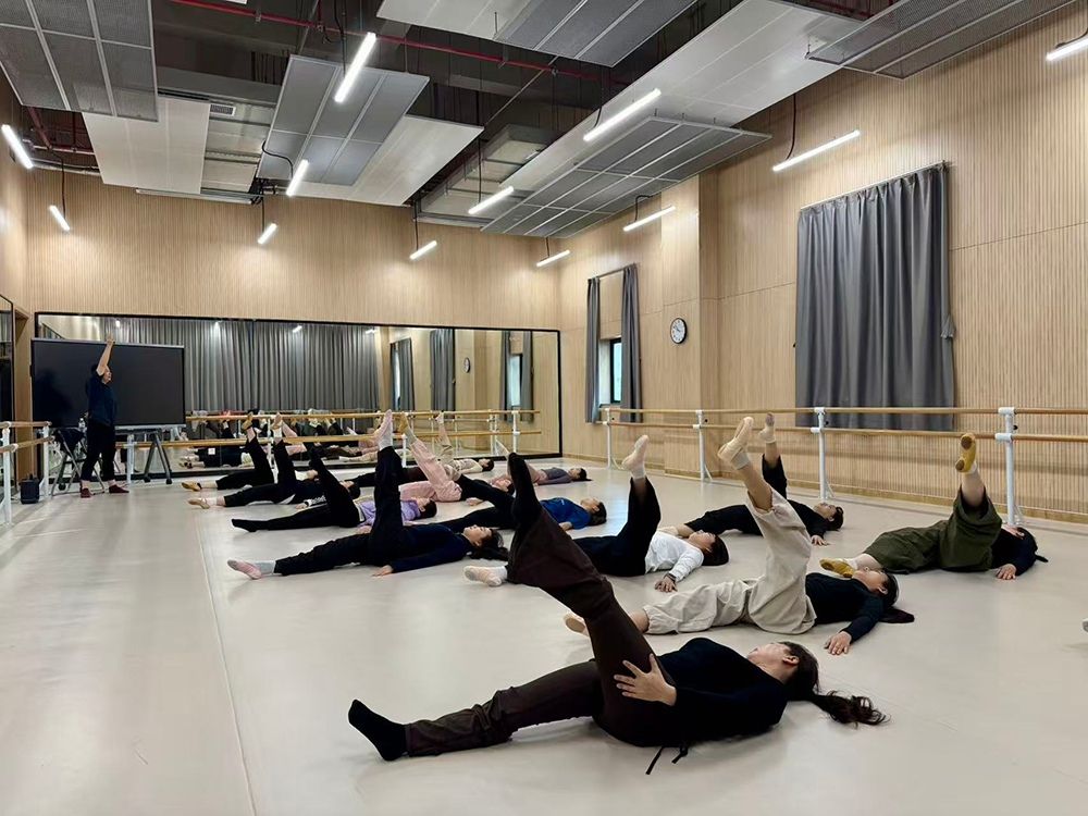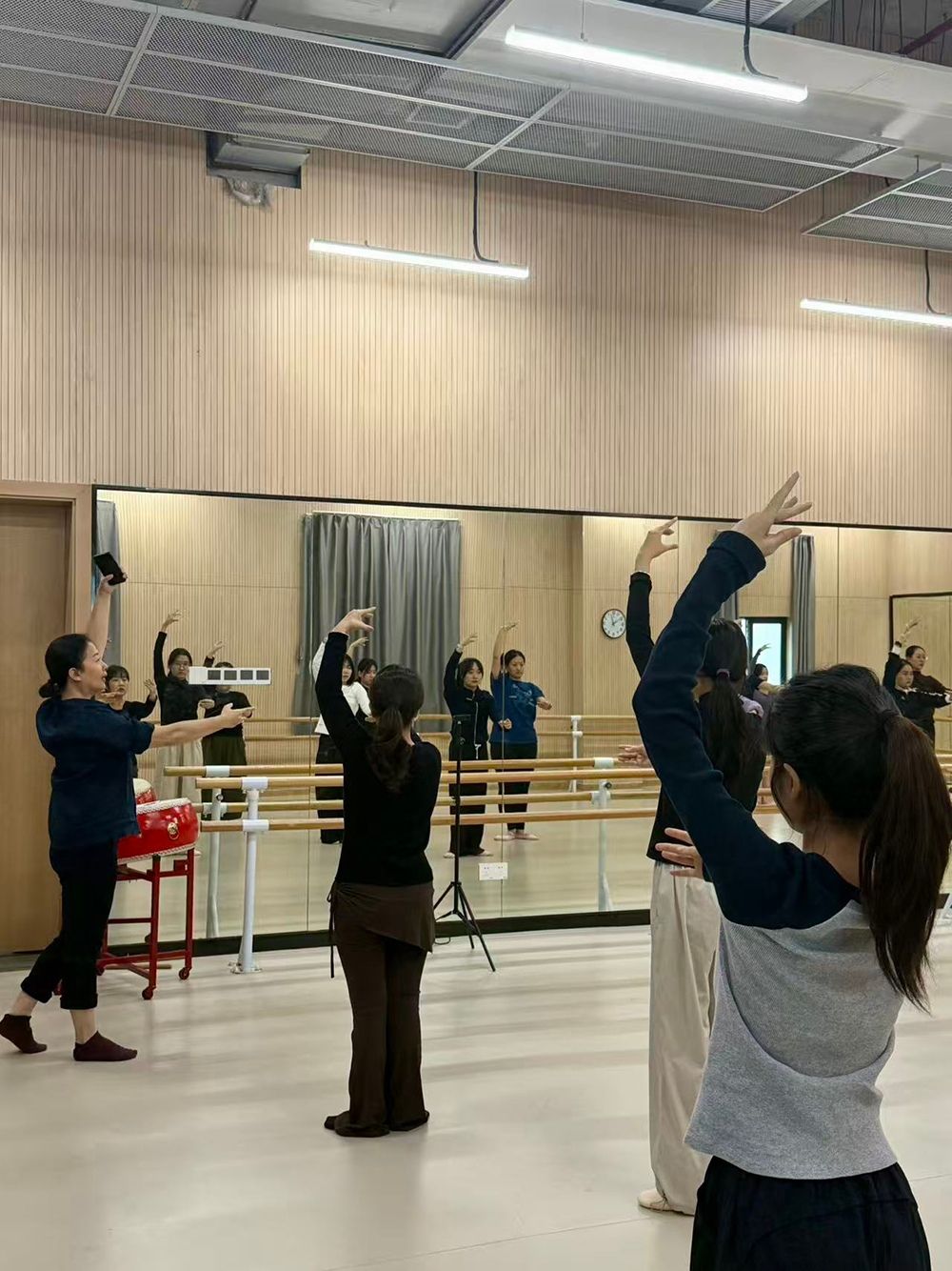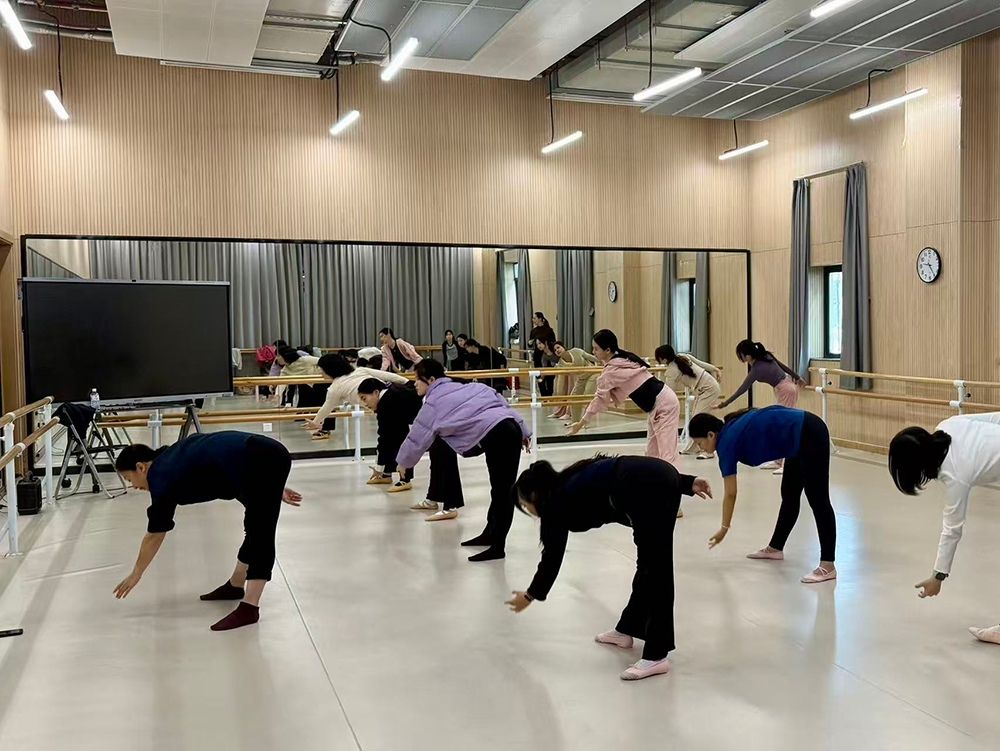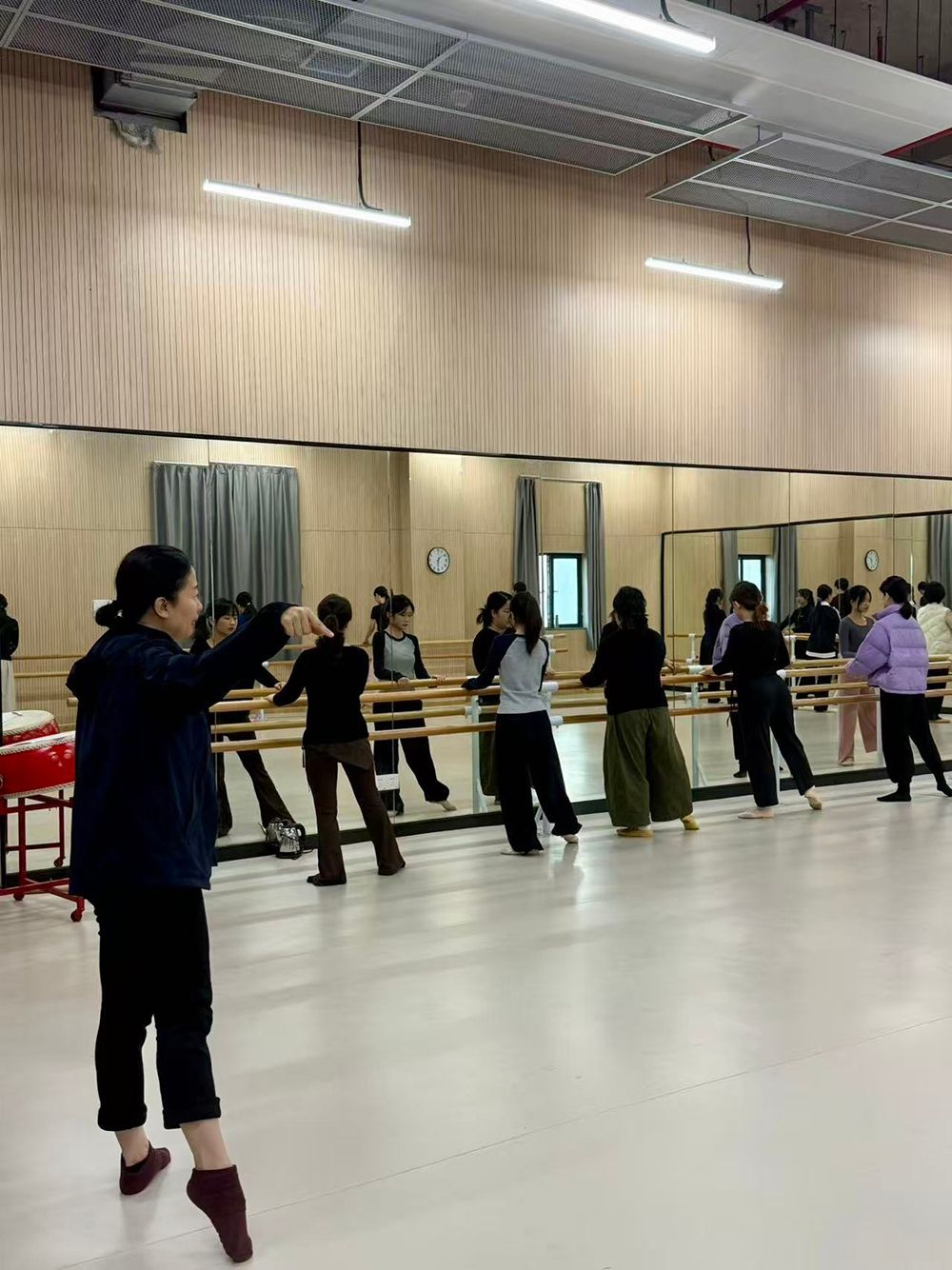 活动伊始,余端嵘从芭蕾基础训练入手,从芭蕾基础体态的唤醒与激活出发,带领全体教师开展系统性的基础肢体活动组合练习。通过针对性地肢体激活训练,余端嵘帮助教师充分舒展身体各部位,为后续专业训练筑牢身体基础,快速进入芭蕾学习状态。地面组合训练是芭蕾功底夯实的核心环节,余端嵘重点指导了地面勾脚组合、地面胯部练习与地面屈伸腿练习。在她的口令引导与标准动作示范下,老师们精准把握每个动作的发力点,反复体会芭蕾对肢体控制力与柔韧性的严苛要求,逐步建立起芭蕾基础体态的核心感知。把杆训练是芭蕾姿态与力量塑造的关键阶段,余端嵘围绕把杆半脚尖练习、把杆蹲练习、把杆擦地练习三大核心内容展开教学。半脚尖练习强化了脚踝力量与身体平衡感,把杆蹲练习夯实了下肢核心支撑力,擦地练习则让老师们掌握了芭蕾脚位移动的核心逻辑。针对每位教师的动作细节,余端嵘逐一指正、耐心调整,确保大家规范掌握专业技巧。老师们不仅熟练掌握了标准的把杆动作,还精准领会了每个动作的发力逻辑与姿态精髓。在最后的芭蕾舞姿练习环节中,余端嵘聚焦手位、脚位、头位的协同配合,引导老师们领会全身合一的芭蕾美学。从手臂的延展弧度到脚尖的精准落点,从头部的姿态控制到身体的韵律协调,老师们在一招一式的打磨中,不仅感受到了芭蕾独特的艺术魅力,更深刻理解了美育教育中“以形塑美、以美润心”的深层内涵,对古典芭蕾艺术中美的表达与传播有了更为透彻的认知。
