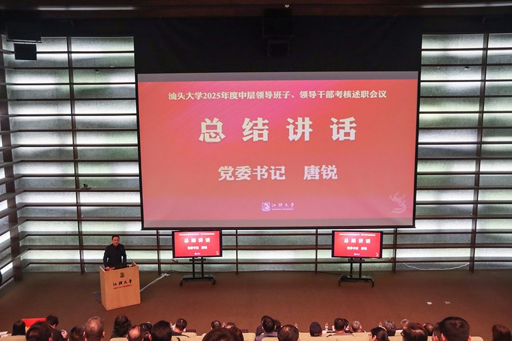 1月19日,汕头大学召开2025年度中层领导班子和领导干部考核述职会议。各单位负责人系统总结2025年工作履职情况,并提出2026年工作目标和任务。校党委书记唐锐作总结讲话。校党委常委、副校长喻洪主持会议。