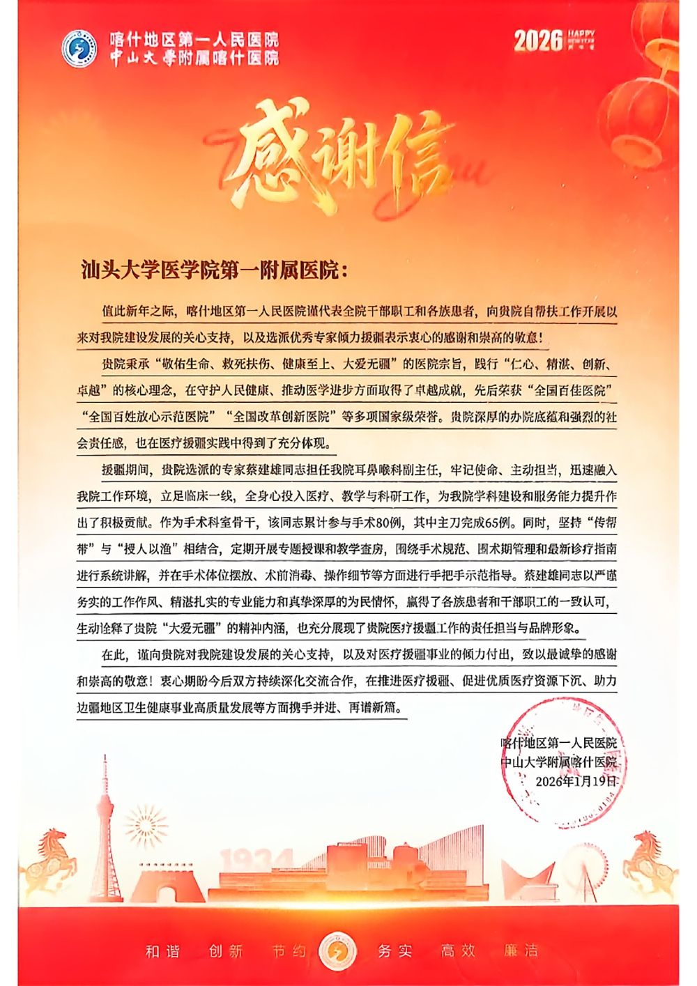 2026年新春,一封来自祖国西部边陲的感谢信抵达汕头大学医学院第一附属医院(以下简称附一院)。喀什地区第一人民医院对附一院援疆专家蔡建雄医生在2025年援疆工作中的突出贡献致以“衷心感谢和崇高敬意”,称赞他“生动诠释了‘大爱无疆’的精神内涵”,并被省级援疆主管部门授予“先进个人”荣誉称号。