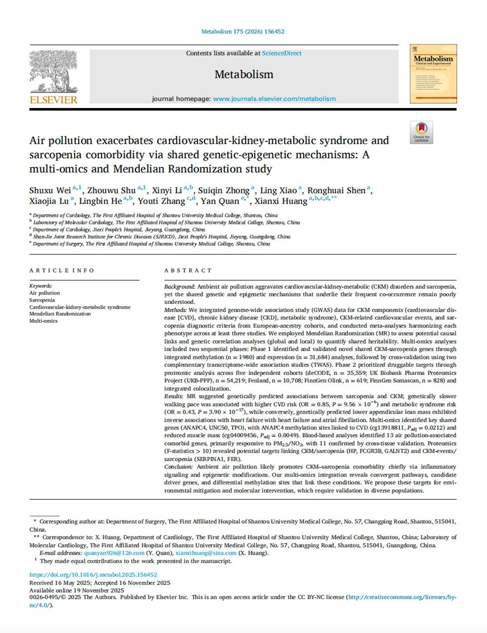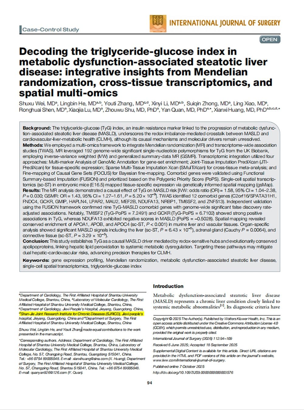 “汕揭联合慢病研究所”系依托附一院资源,通过科研合作、技术指导、学术交流、培养人才等方式,以“互联网慢病管理网络体系”覆盖揭西“乡村——镇——县”,围绕常见高发慢病,制定统一标准化流程,建立适合基层推广的适宜技术和防控策略,降低慢病发病率、致残率和死亡率,提升县域居民健康水平和生活质量。与“汕揭联合慢病研究所”成立这一消息同步传来的,是一条令人振奋的科研捷报。近期,黄贤锡团队与张优惕团队经过前期的工作积累,依托“汕揭联合慢病研究所”平台,联合在国际顶尖学术期刊《International Journal of Surgery》(5年平均影响因子10.3)、《Metabolism》(5年平均影响因子11.8)上连续发表两篇影响因子超过10分的SCI收录论文(汕大附一院及揭西县人民医院均为通讯单位),再一次创造了揭西县域医疗单位在高水平基础与临床研究领域的新纪录。据悉,2025年黄贤锡团队与张优惕团队已联合发表3篇SCI收录论文,因此至今,他们已经联合发表5篇SCI收录论文,其中4篇为JCR 1区,总影响因子达40分。