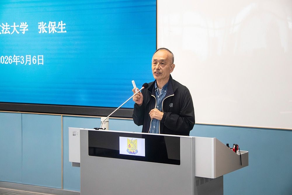 3月6日下午,法学院与格致书院联合举办2026年“崇法景行 至公守正”法律文化节开幕式暨法律专题讲座。开幕式特邀中国政法大学原副校长张保生教授,就“人工智能法律系统的挑战与对策”这一主题开展专题讲座。法学院院长邓剑光教授、党委副书记张丽婷、法律系主任张扩振副教授、李守良教授,以及160余名同学参与了此次活动。活动由邓剑光主持。