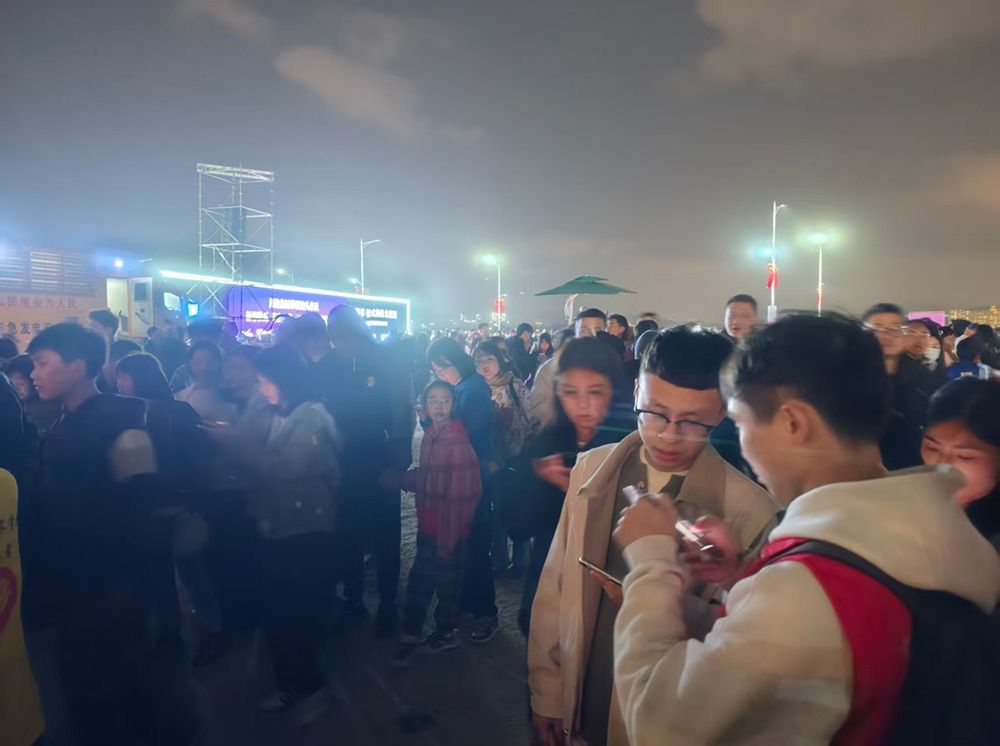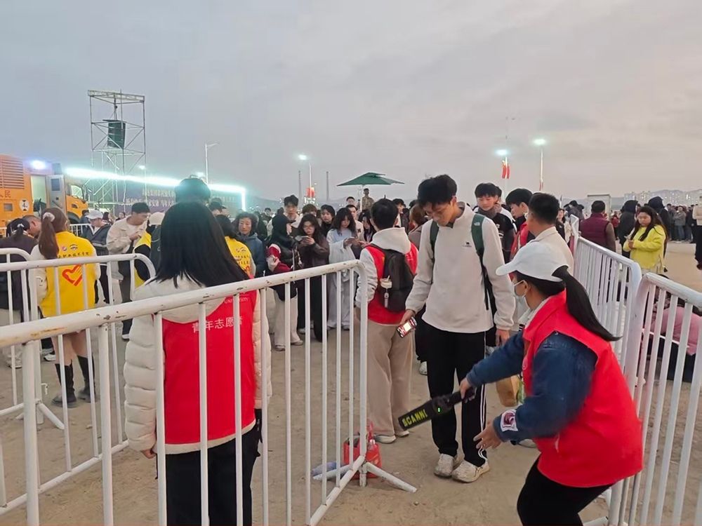 从午后到夜幕,志愿者们始终坚守在露天的安检区域。下午时分,烈日当空,阳光毫无遮挡地倾泻而下,汗水很快浸透了志愿马甲;而随着暮色四合,海风渐起,入夜后的凉意悄然漫上指尖。