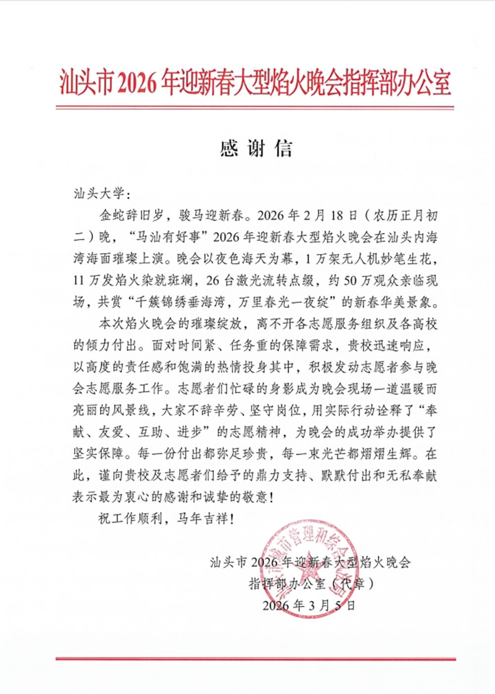当万家团圆、灯火可亲之时,2026年汕头市迎新春大型焰火晚会在内海湾璀璨上演。近日,汕头大学收到了汕头市2026年迎新春大型焰火晚会指挥部办公室的感谢信。原来,在这场视觉盛宴的背后,有一群年轻的身影默默坚守——他们就是来自汕头大学的志愿者。他们用奉献与热情,为晚会的顺利有序举办保驾护航。