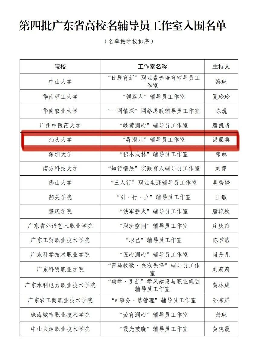 近日,广东省教育厅发布《关于第四批广东省高校名辅导员工作室入围名单的公示》。经组织申报、专家评审和现场答辩等环节,汕头大学“弄潮儿”辅导员工作室(主持人:洪蒙典,长江新闻与传播学院党委副书记)凭借鲜明特色和扎实成效,成功获批第四批广东省高校名辅导员工作室,这是学校深耕思政教育、创新育人模式的重要成果,彰显了汕大思政工作的专业实力与鲜明特色。