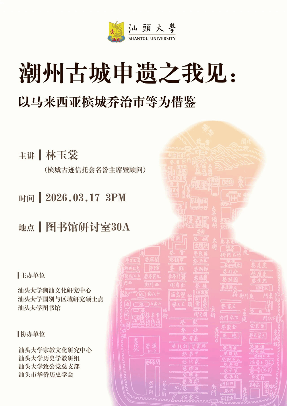 为助力潮州古城申报世界文化遗产和汕头“小公园开埠区”申报国家级历史文化街区,推动汕头大学区域国别研究学科建设,发挥侨海优势,促进中外文化交流,3月17日下午,汕头大学潮汕文化研究中心等单位特邀马来西亚槟城古迹信托会名誉主席暨顾问、央视《国家宝藏》栏目“国宝守护人”、首届“广东省友谊奖”获得者林玉裳女士莅临汕头大学图书馆作专题学术讲座《潮州古城申遗之我见:以马来西亚槟城乔治市等为借鉴》。