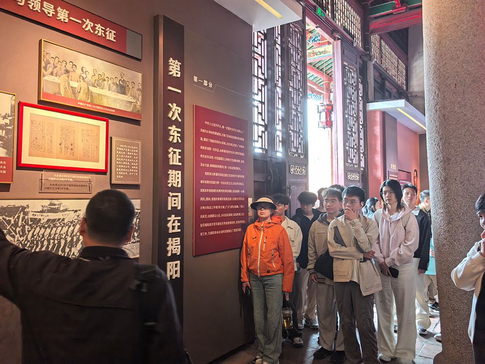 在揭阳学宫,师生们追寻周恩来同志三临揭阳的革命足迹。1925年至1927年间,周恩来先后三次到此,在学宫崇圣祠办公居住,指导组建党团组织,召开军事会议,为潮汕革命运动奠定了坚实基础。研学现场,师生们驻足聆听革命先辈播撒火种的故事,在历史的回响中读懂何为初心。不少同学表示,站在先辈战斗过的地方,才真正体会到信仰不是抽象的概念,而是危难时刻的选择与坚守。革命精神不只是课本上的文字,而成为可感可触的精神力量。