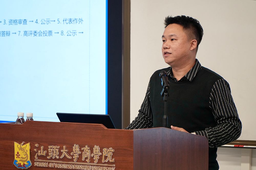 在专题分享环节,丘嘉闻围绕“职称评审政策解读”作专题分享。他结合近年来学校职称评审工作的整体情况,对青年教师关注的评审规则、流程、注意事项等内容展开详细介绍,并对评审过程中常见的问题提出针对性的建议。丘嘉闻的分享帮助青年教师进一步了解评审机制,有效增强了青年教师在职称晋升方面的信心。