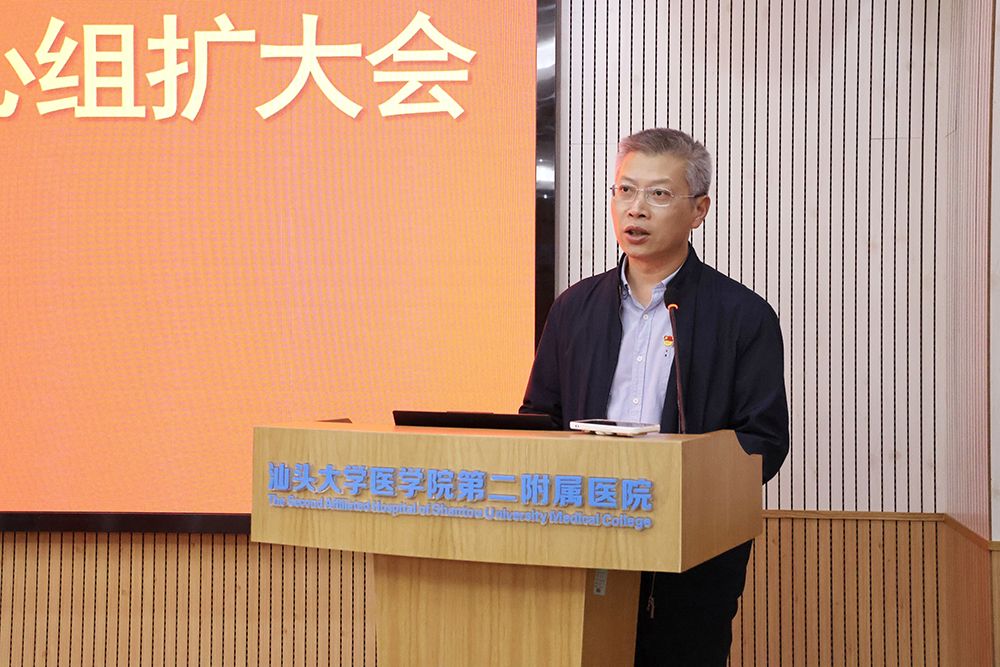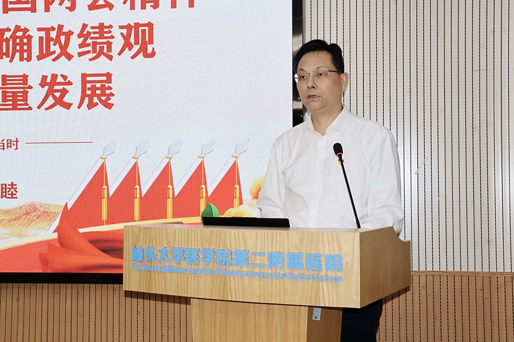 为深入学习贯彻2026年全国两会精神,扎实开展树立和践行正确政绩观学习教育,3月24日下午,汕头大学医学院第二附属医院(以下简称附二院)召开党委理论学习中心组扩大会。医院党委书记江耀睦以“学习贯彻全国两会精神,以树立和践行正确政绩观引领医院高质量发展”为题授课,医院党政领导班子成员、党委委员、纪委委员,各职能科室科级干部,各党支部书记参加会议。会议由医院党委副书记、院长陈业晞主持。