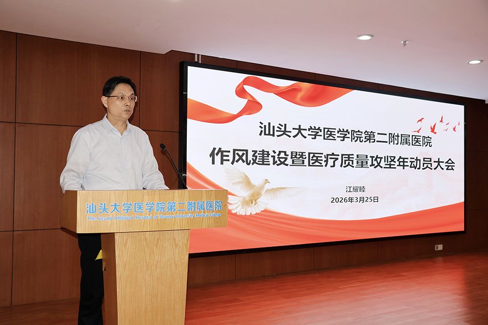 为深入贯彻落实2026年全国两会精神,牢固树立和践行正确政绩观,进一步转作风、强质量、优服务、提效能,切实筑牢医院发展根基,3月25日,汕头大学医学院第二附属医院(以下简称附二院)召开“作风建设暨医疗质量攻坚年”行动动员大会。医院党委书记江耀睦作工作部署并作动员讲话,为全院开展作风建设和医疗质量攻坚工作锚定方向、划定路径、压实责任。