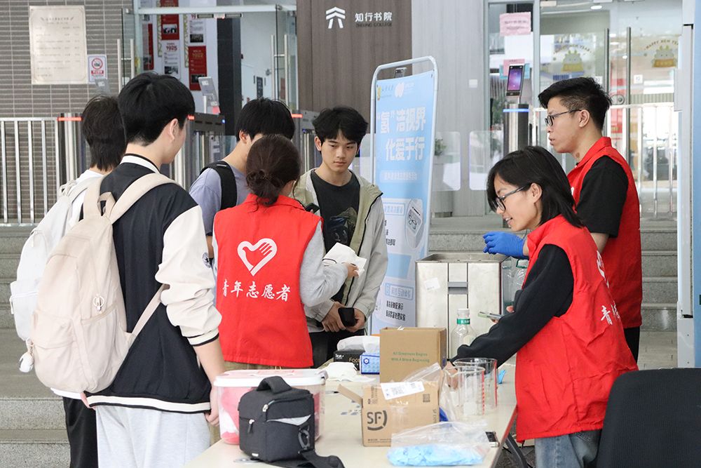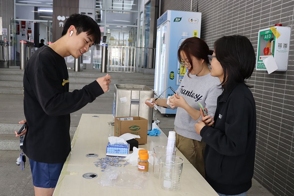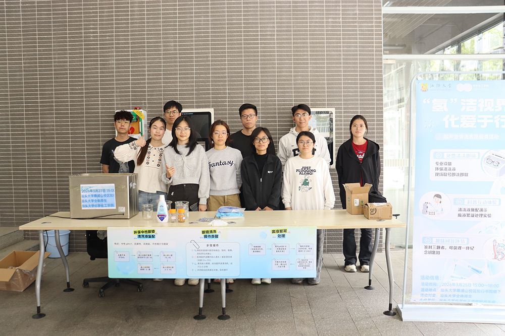 3月27日下午,活动在桑浦山校区知行书院一楼公共区举行。依托学院专业资源打造的免费眼镜清洗、化学科普演示及趣味问答服务,凭借“专业+实用+趣味”的鲜明特色,迅速吸引大批师生驻足参与,成为校园里一道兼具温度与专业感的风景线。