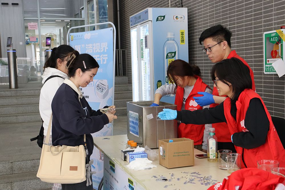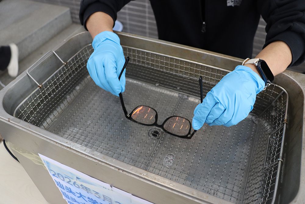 活动现场,志愿者们运用超声波清洗机,搭配学院自主配备的环保清洗液,为师生提供眼镜深度清洁服务。“现场取号,即取即洗”的便捷模式,兼顾效率与体验,让师生在碎片化时间里,完成对眼镜进行深度清洁。每一副洁净如新的眼镜,都承载着化学学子的专业素养与服务初心。