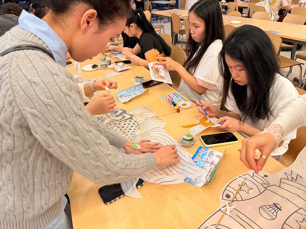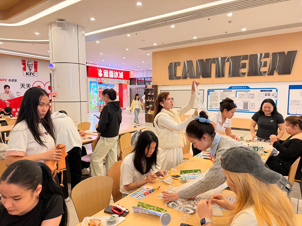纸鸢DIY环节充满了创意与乐趣。纸鸢作为清明传统民俗的重要载体,寄托着人们祈福消灾、向往美好的心愿。主持人以多语种的方式为同学们讲解了纸鸢的历史由来与简易制作方法,食堂提供了半成品材料与绘画工具。同学们发挥想象力,用彩笔在纸鸢上绘制图案、书写中英文祝福,有的写下对未来的期许,有的描绘春日美景,还有的创作了融合本国文化特色的纹样。两人一组协作组装、调整平衡,一只只色彩斑斓、独具特色的纸鸢应运而生,承载着同学们的美好心愿,成为活动现场一道亮丽的风景线。