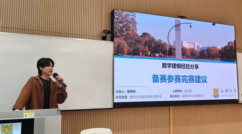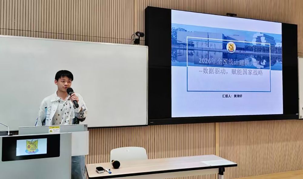 黄琦轩同学首先从赛事的定位及其与国家战略需求之间的关系出发,对比赛进行了简要阐述;随后,他向同学们介绍了四大核心建模主题,为同学们的备赛提供了明确的方向。最后,他对往期比赛的获奖作品进行了详细分析,为同学们总结了比赛中的注意事项与提升建议,并分享了实用的数据资源与处理平台。