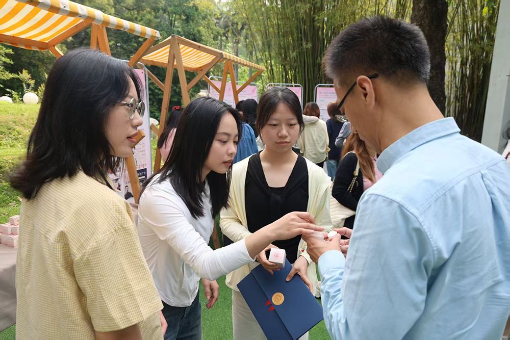 仪式开始前,淑德书院草坪庭院成果展区人气高涨。首期项目团队带来的各类成果集中亮相,精致的钩织产品、“山海邮差”系列周边、“美研计划”面霜等特色产品错落摆放……项目成员主动向师生们讲解项目研发历程与实践成果,现场互动氛围热烈,充分展现了跨学科实践的鲜活成果。