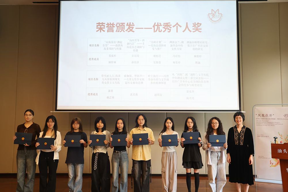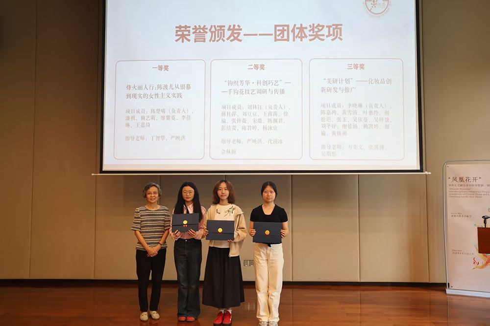 经评审,“烽火丽人行:陈波儿从银幕到现实的女性主义实践”项目获团体一等奖,“钩织芳华·科创巧艺”潮汕手钩花技艺调研与传播项目获团体二等奖,“美研计划”化妆品创新研发与推广项目获团体三等奖,16名学生获评优秀个人。罗敏洁与林锦香共同为优秀团队及优秀个人颁发荣誉证书。