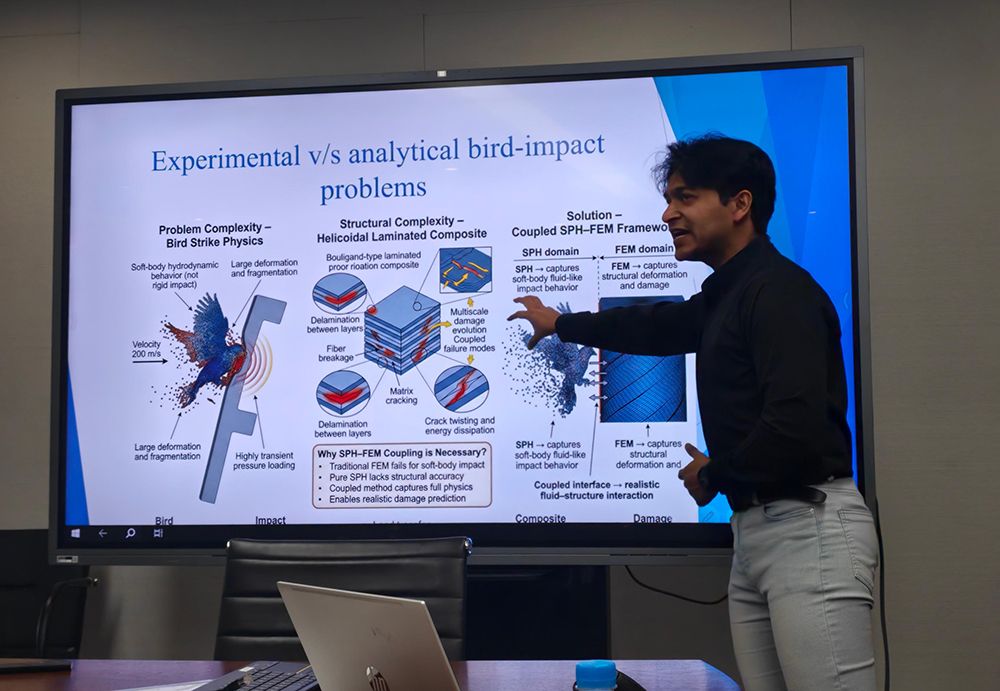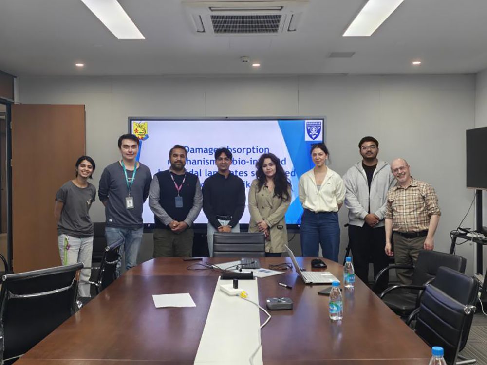 本次交流活动由西交利物浦大学健康与环境科学系副教授、英国土壤科学学会会士、原汕头大学工学院土木与环境工程系副教授Ankit Garg博士邀请开展,阿曼·加格围绕“受生物启发的螺旋层合板在鸟撞荷载作用下的损伤吸收机制”主题作特邀学术报告。报告中,他结合自身近期研究成果,系统介绍了受甲壳类外骨骼等生物结构启发的螺旋层合板材料,深入阐释了该类复合材料通过裂纹扭转、分层延迟与渐进式失效等机制优于传统层合板的抗冲击性能,并分享了采用有限元法与光滑粒子流体动力学(SPH)方法开展研究的核心思路,其研究成果为航空航天及防护结构材料设计提供了重要理论参考,获得了参会学者的高度认可。