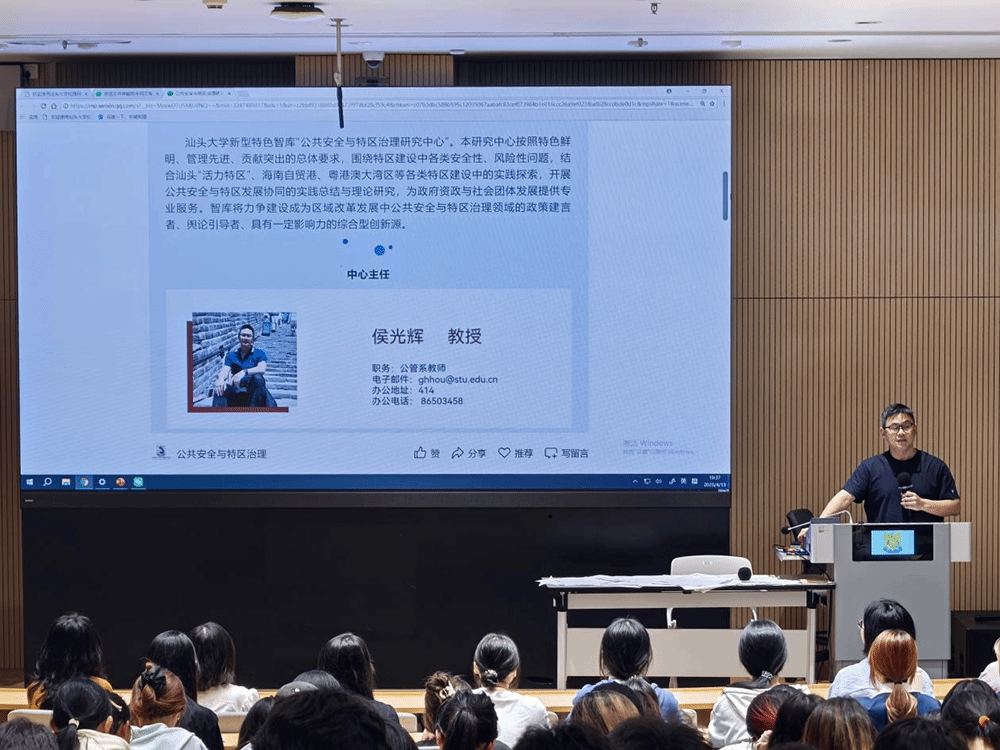 公共安全与特区治理研究中心由侯光辉教授进行介绍。该中心是广东省高校特色新型智库,结合汕头“活力特区”、海南自贸港、粤港澳大湾区等各类特区建设中的实践探索,聚焦公共安全、社区治理与特区各类风险安全问题开展研究。中心采用“教师+研究生+大四毕业生+低年级学生”的传帮带运营机制,促进不同年级学生交流碰撞,帮助学生明确发展方向、提升科研与团队协作能力。