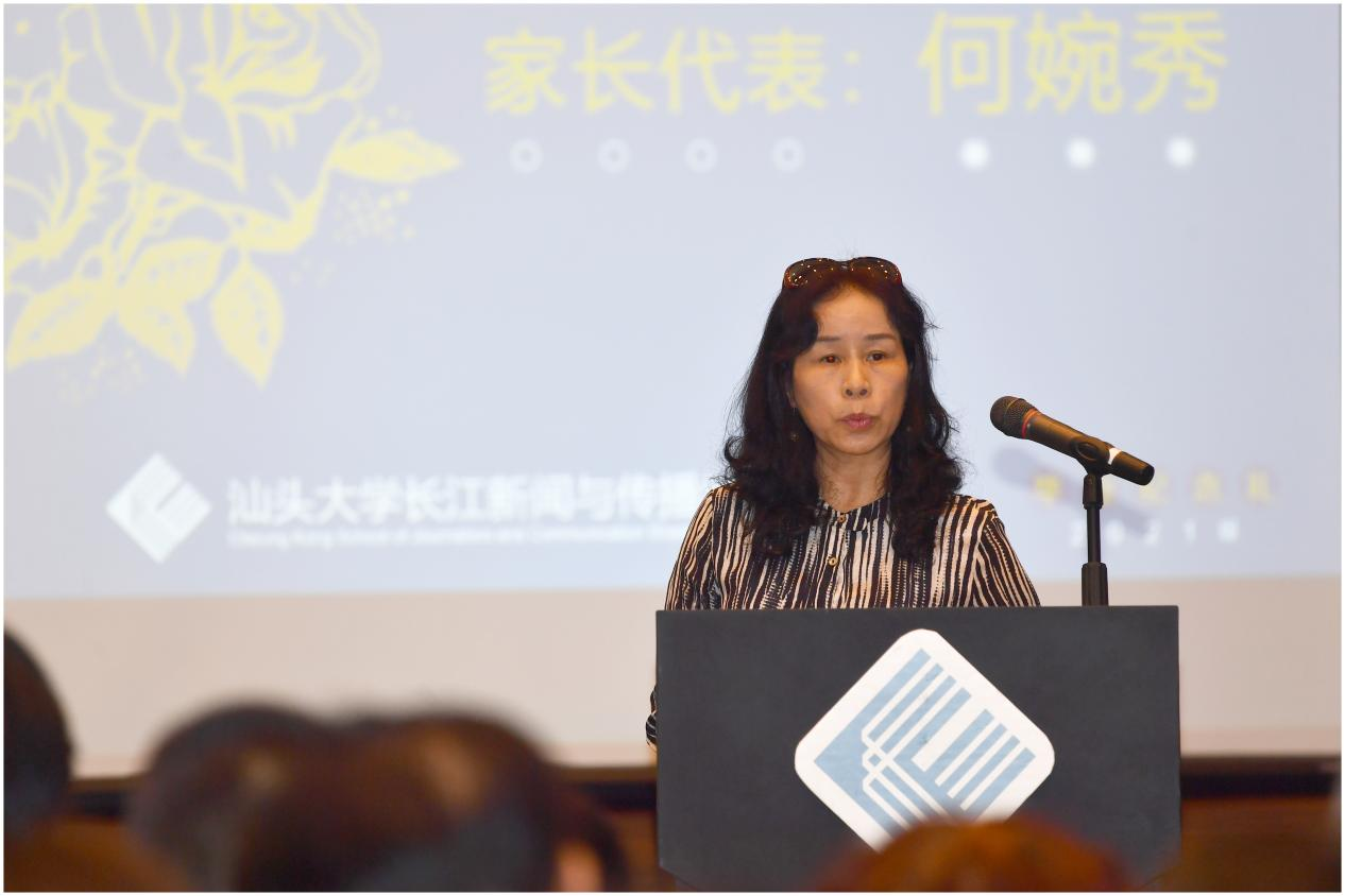 2017级广播与电视专业毕业生曹梓沁同学的母亲何婉秀作为毕业生家长代表发言,以真切的言语表达了对汕头大学以及长江新闻与传播学院的感谢,认真又关切地向毕业生们表示:本科毕业是人生的新起点,但是不论遇到多少委屈、困难,家是温暖的港湾,母校是坚强的后盾。