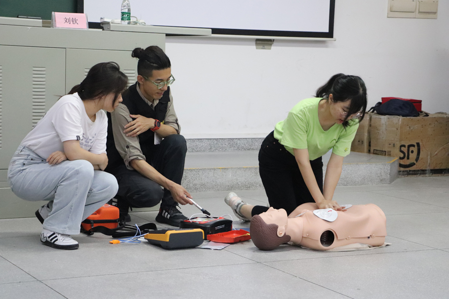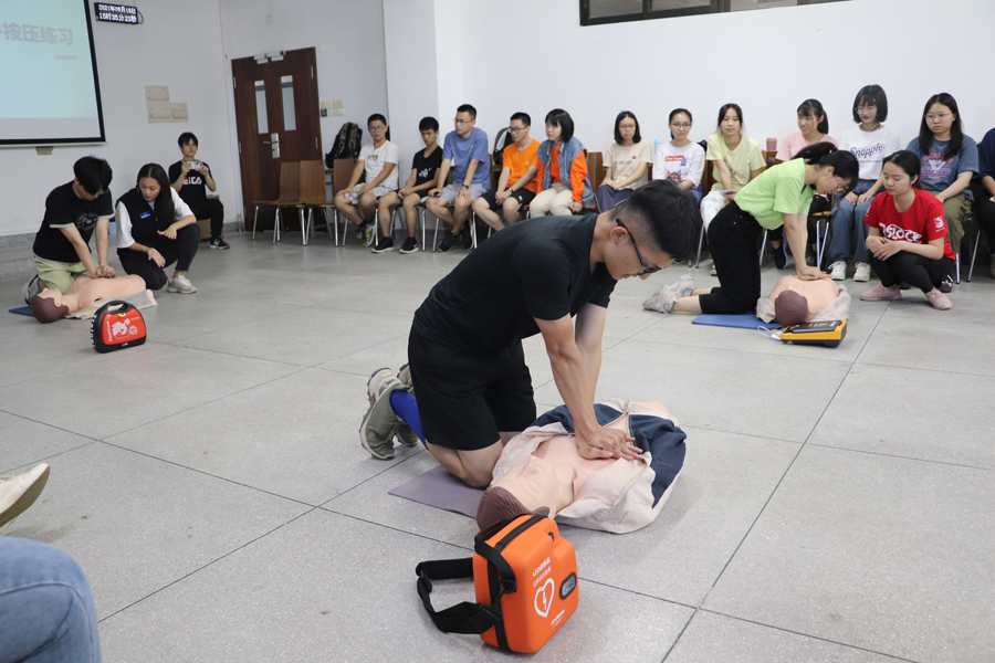 刘钦老师就心肺复苏CPR的具体操作步骤、操作小技巧和常用的实战方法为同学们进行详细讲解,并对心肺复苏术的一些常见误区进行了解释,并且邀请同学们上台进行模拟演示。