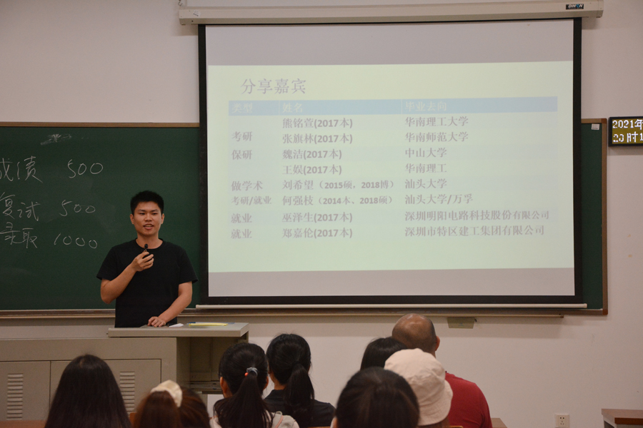 为了帮助理学院在校学生提高就业能力,有针对性地做好学业规划,合理安排保研、考研、求职、留学之路,理学院在五月份举办了各系优秀毕业生分享会。现场座无虚席,气氛十分活跃,同学们踊跃提问,希望能够得到更多的指引和帮助。各系的系主任、副系主任以及学院骨干教师等出席了分享会。