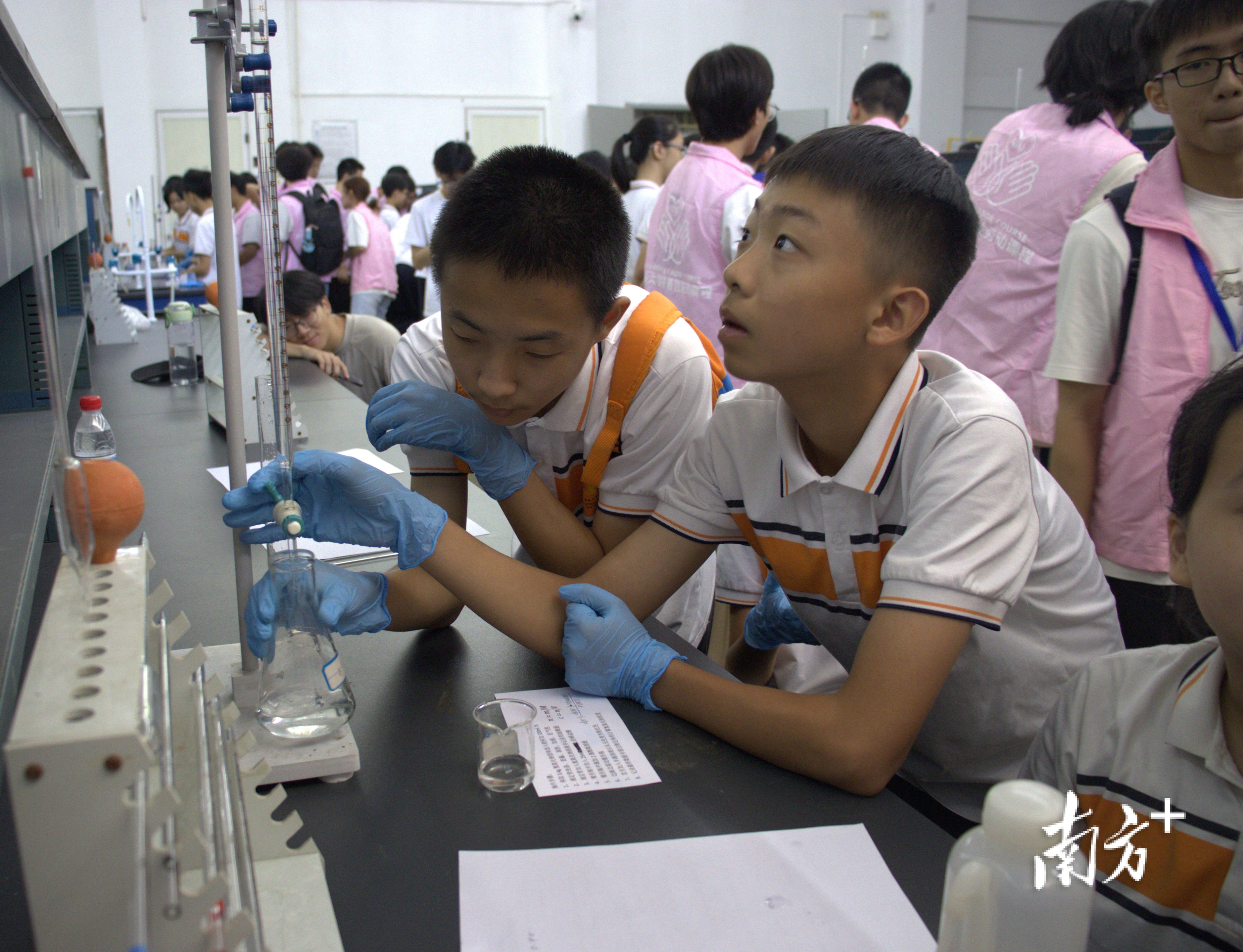 “注意观察,终点就在粉色出现的瞬间。”汕头大学化学化工学院的实验室里,一群初中生们正在志愿者的指导下,动手操作一场酸碱中和滴定实验。从调整滴定管活塞的专注,到看见无色溶液中泛起浅粉色且半分钟不褪色时的沸腾,孩子们在色彩变化的指引下理解“控制误差、数据严谨”的科学精神。