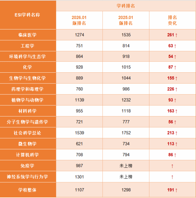 2025年,学校原有的12个ESI前1%学科排名全部进步,其中6个学科位次提升超过100位。免疫学与神经科学与行为学为新晋学科。