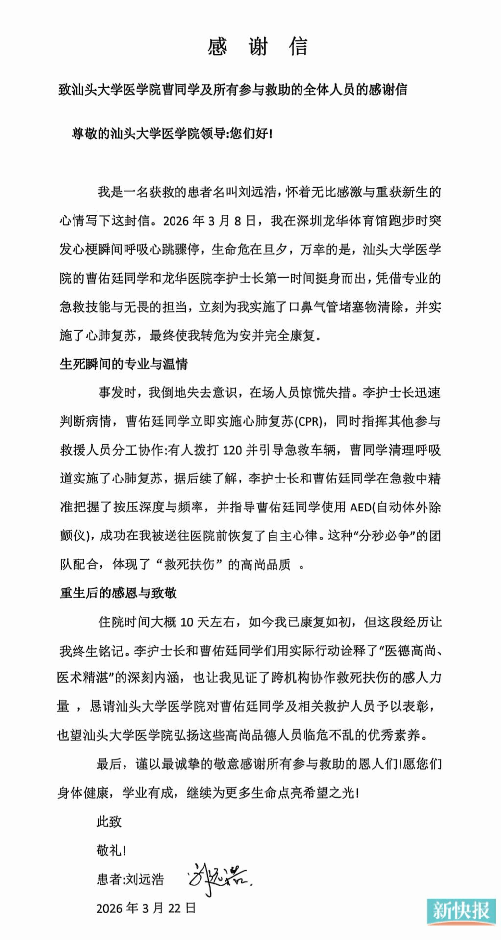 “我学过护理,我来做心肺复苏!”3月22日,一封“致汕头大学医学院曹同学及所有参与救助的全体人员的感谢信”被送到了汕大医学院的领导手中。记者从汕头大学获悉,来信者是日前在深圳市龙华文体中心的跑道上晨跑时突然倒地的刘先生。
