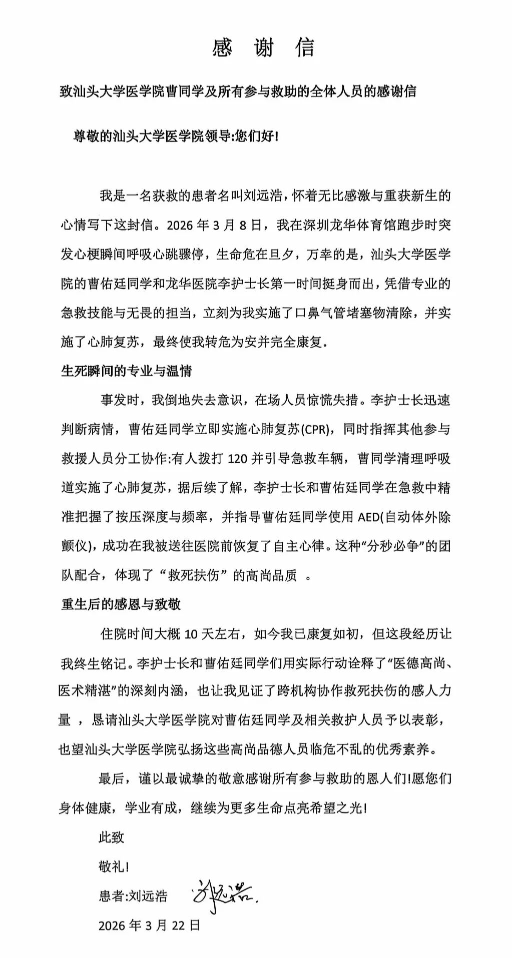 刘先生康复后,第一时间致电汕头大学党委宣传统战部,讲述了被曹佑廷施救的经历,表达对学校培育优秀学子的诚挚感谢。党委宣传统战部接到电话后,迅速开展相关工作,深入了解相关情况。同时,刘先生写下感谢信,向曹佑廷、李护士长及所有参与救助的人员表达重获新生的感恩之情。