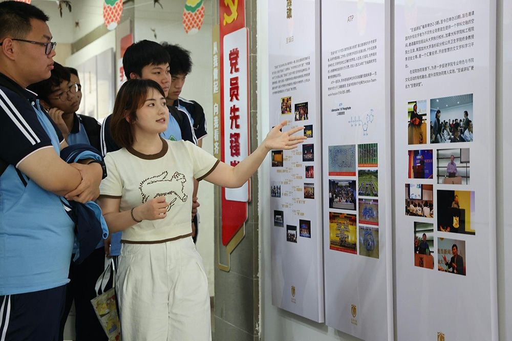 导生会会长伍雨佳、简晓彤为来访师生介绍了至诚书院的创办历史、育人理念、书院文化以及“一站式”社区建设情况,同时分享了至诚书院在理想信念、学科拓展、美育浸润、劳动教育、职业规划、心理辅导等方面的典型做法和品牌活动,赢得了在场师生们的阵阵掌声。声情并茂的讲解加上书院大厅文化墙的一幅幅画面,让来访师生切实感受到至诚书院带给学生的成长和温暖。