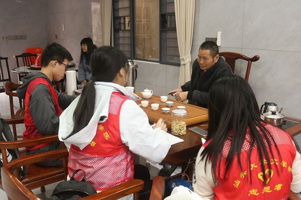 在村干部张樱樱的带领下,另一队队员叩开村民的家门,在氤氲的茶香中,聆听了村民刘建卫如数家珍般的讲述。