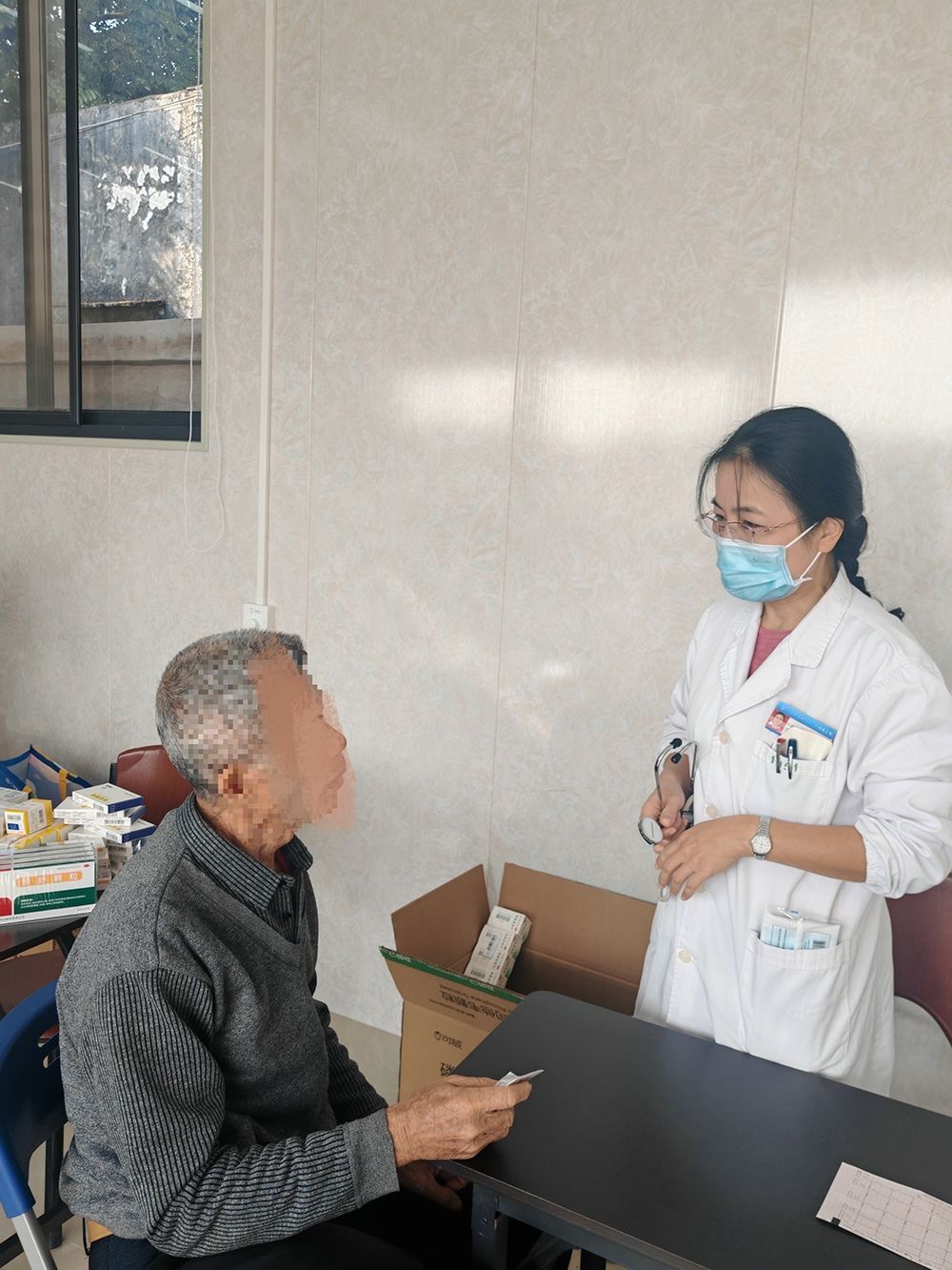 义诊于上午九点开始,闻讯赶来的村民早已在现场有序等候。专家们一下车便立即投入工作,耐心细致地为每一位村民提供常见病、慢性病诊疗咨询(如高血压、糖尿病、关节疼痛等)、免费心电图检查、彩超检查、血压及血糖免费测量、中医理疗等服务。医院还准备了常用药品,免费向有需要的村民派发,并提供详细的用药指导。