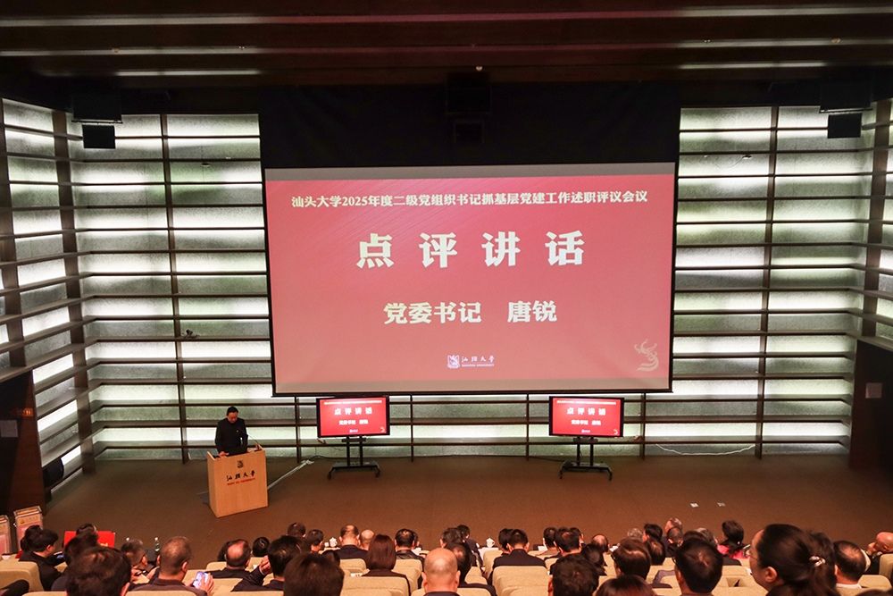 1月19日上午,汕头大学召开2025年度二级党组织书记抓基层党建工作述职评议会议,同时召开学校党的建设工作领导小组会议和2026年第1次二级党组织书记会。会议系统总结2025年各二级党组织党建工作的成效和经验,研究查摆问题和不足,推动2026年党建工作开好局、起好步、谋新篇。校党委书记唐锐作点评讲话。校党委常委、副校长喻洪主持会议。唐锐指出,2025年是实现“十四五”规划目标的收官之年,也是迈向“十五五”发展新征程的奠基之年。... >>